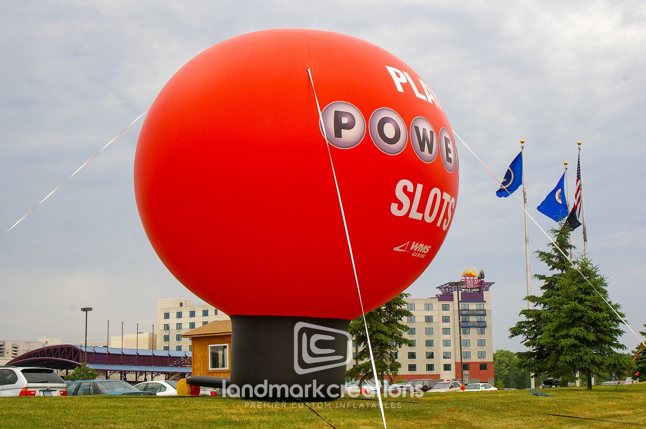 Giant Powerball inflatable display promotes Grand Casino's new slot machine games to passersby and guests entering the facility. Because they're easy to set-up and store between promotions, custom inflatables are a perfect way to announce new offerings or events at any hotel or casino.