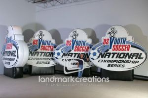 This is what most people think of when inflatables come to mind. Available in custom sizes and designs, cold-air inflatables can be mounted on the ground, on rooftops, indoors or at any fixed location. They inflate with the aid of a blower system in just minutes bringing your product replica, mascot, logo or sports tunnel to life.
