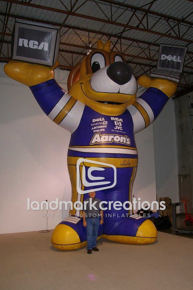 Lucky Dog is the official mascot of Aaron’s, you'll find this giant inflatable mascot of him at NASCAR races, Aaron’s stores, and other sporting events all over the U.S. and Canada.
