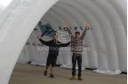 Caribou Coffee gets double duty from their inflatable sports tunnel, using it as a start/finish line at races and as a sheltered gathering place for passing out product samples.