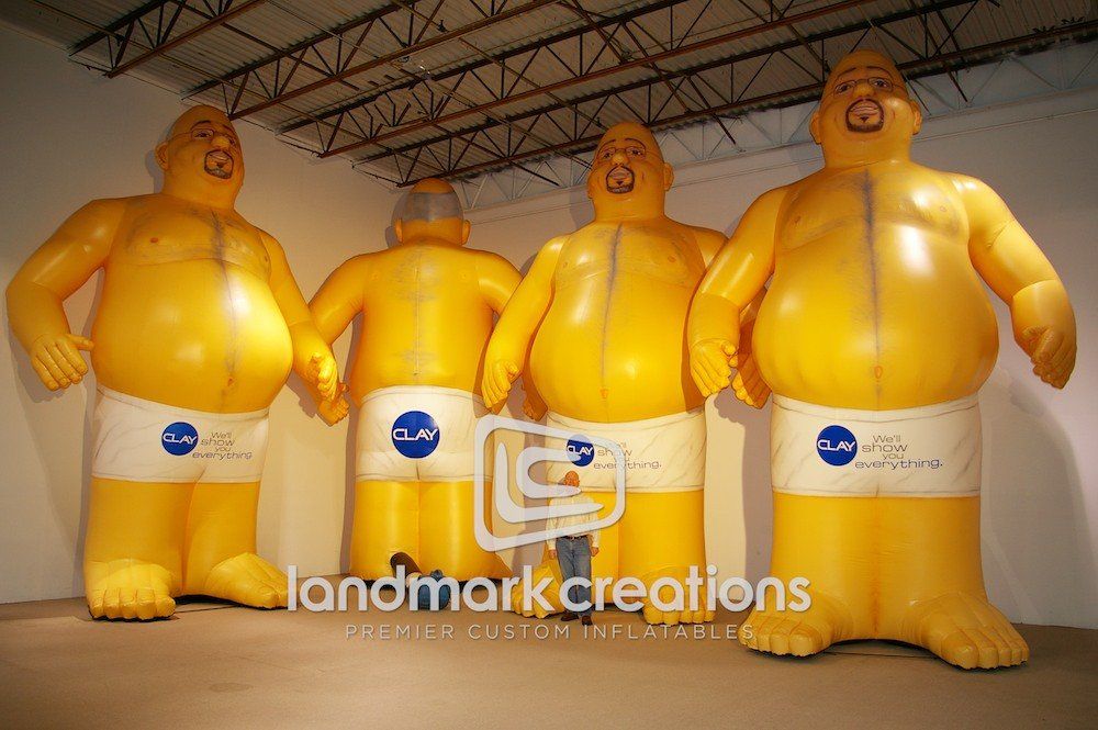 What a way to attract attention! These comical giant inflatable bald men in boxers help increase traffic for Clay Motors.
