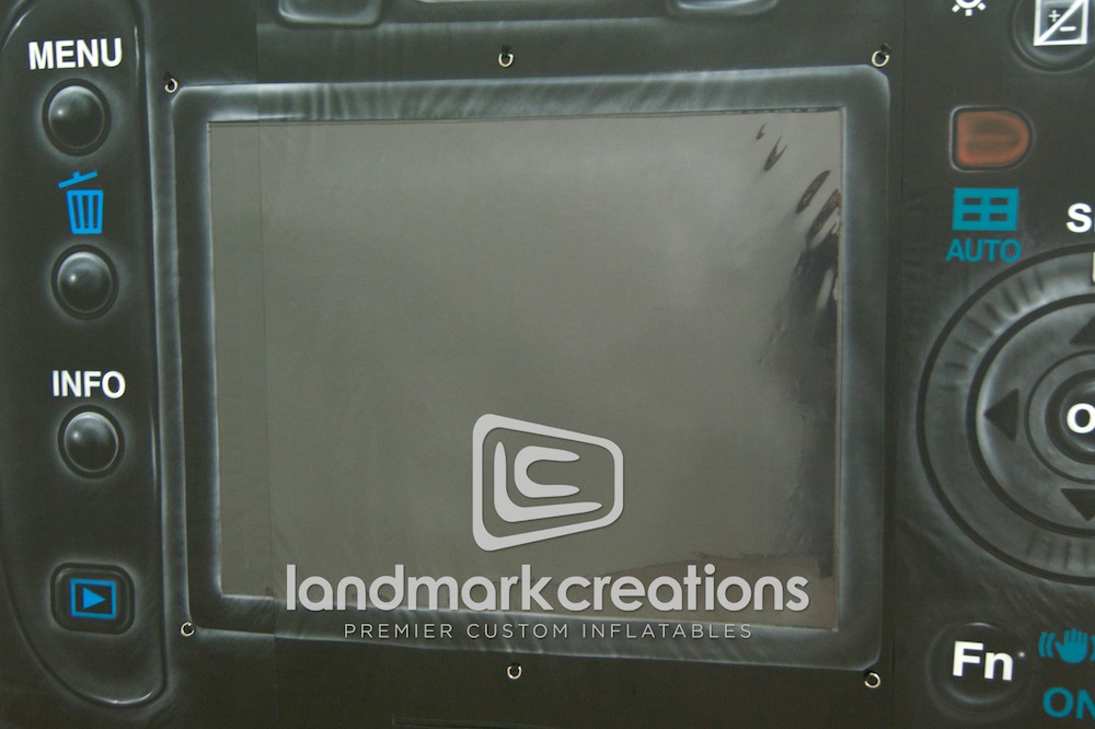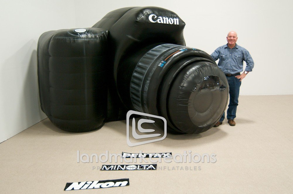 Giant, inflatable product replicas help retail stores, like Camera-Stop, draw attention to new product lines and increase sales. Customers will even line up to get their picture taken with this massive-sized product.