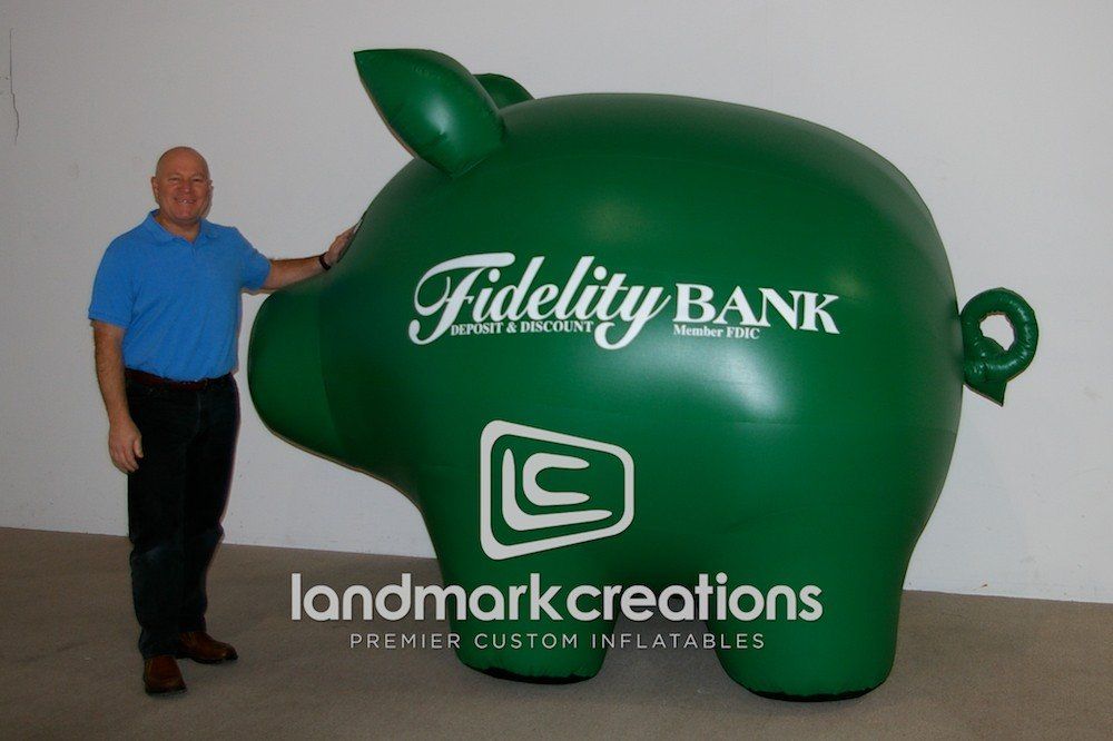 Looking for a creative way to drive traffic to a newly opened bank branch? Custom inflatable piggy banks, like this one for Fidelity Bank, naturally attract attention from those passing by.