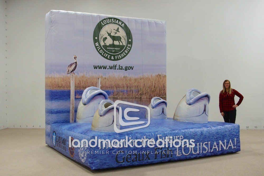 The Louisiana Department of Wildlife and Fisheries commissioned this custom-built, interactive pond inflatable. It was used to inform visitors about their Saltwater Series campaign, a program created to promote the conservation of Louisiana's sport fishing resources. The goal - to enhance the resource while providing a competitive opportunity for both avid and new fishermen.