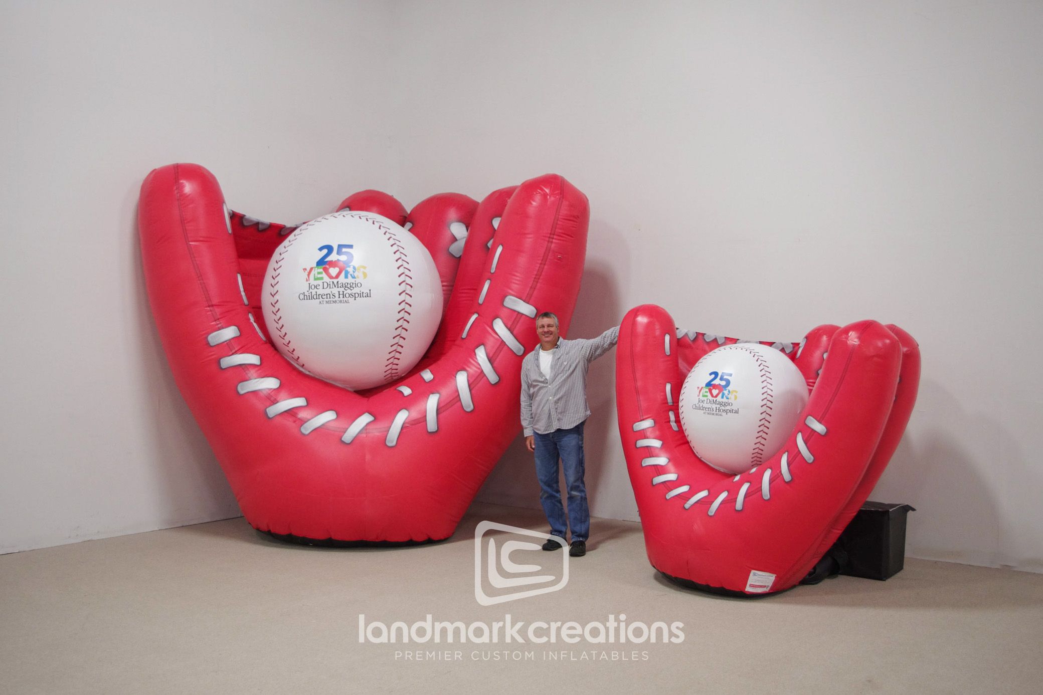 Crafted for Starmark's event benefiting Joe DiMaggio Children's Hospital, this custom inflatable red baseball glove replica featured a zippered palm for interchangeable baseballs, enhancing engagement at the Hollywood, FL fundraiser.