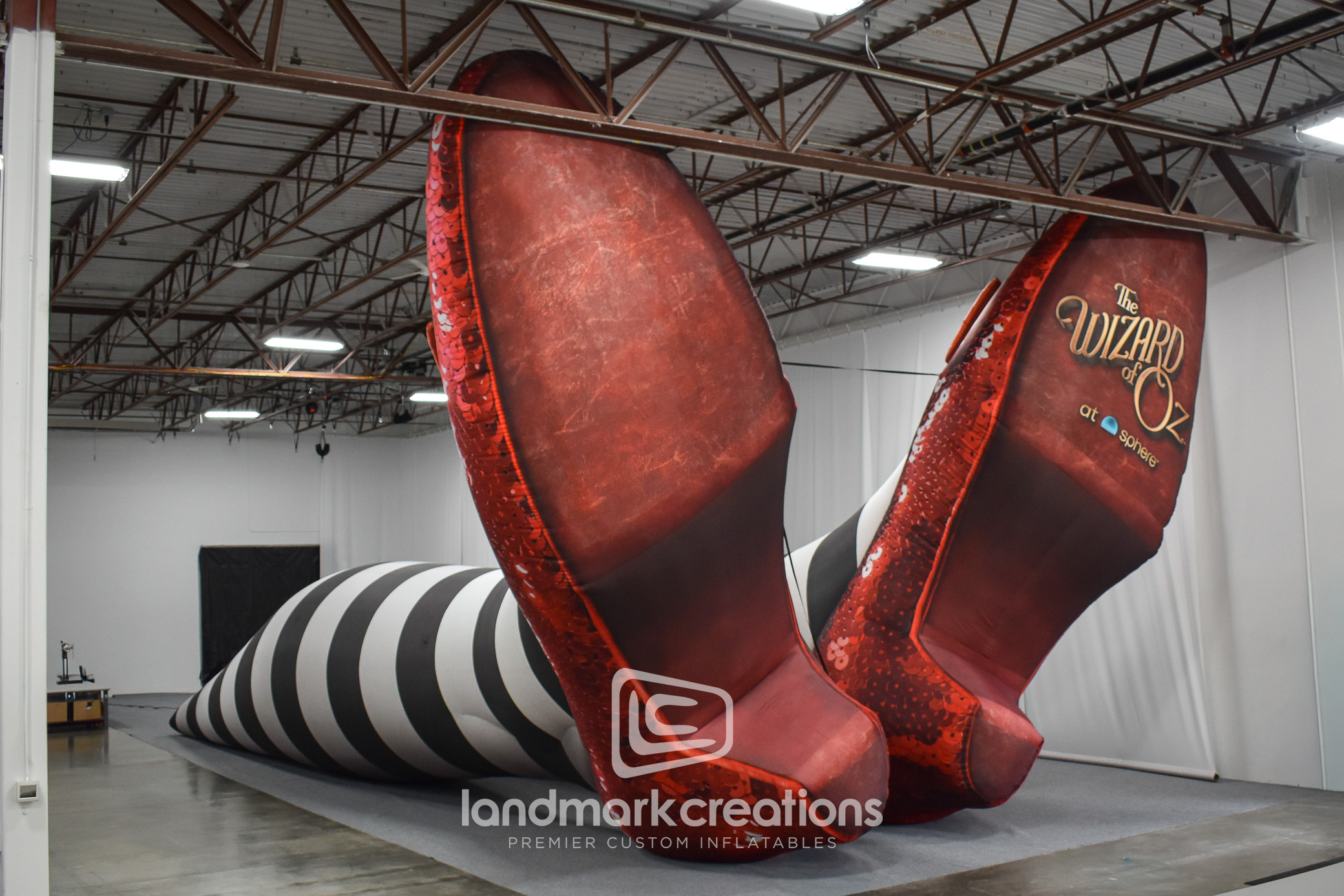 To help bring The Oz Experience to life outside The Sphere in Las Vegas, MSG Entertainment partnered with Landmark Creations to produce a towering pair of inflatable legs wearing ruby slippers. Standing 26 feet tall, this custom inflatable sculpture created a whimsical, oversized photo op for fans and media alike. Designed for medium-term outdoor use, the display helped boost engagement, support a themed environment, and generate social buzz during the activation.