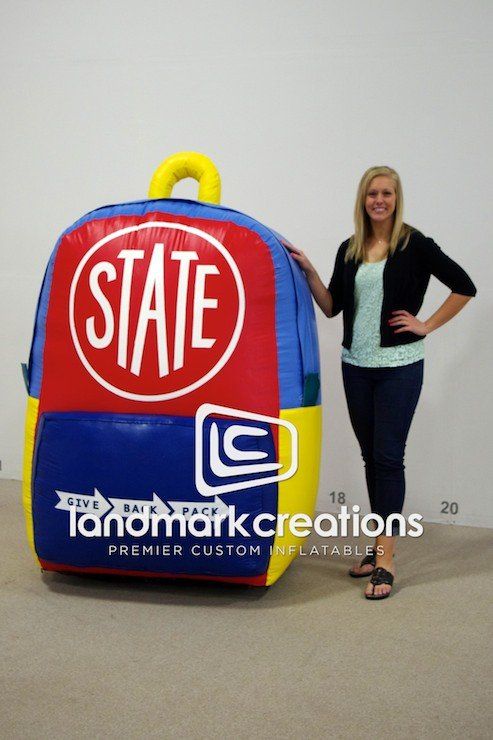 STATE BAGS, a backpack retailer that gives back to impoverished American children, promotes their products at marketing events with this colorful, 6-foot backpack replica.