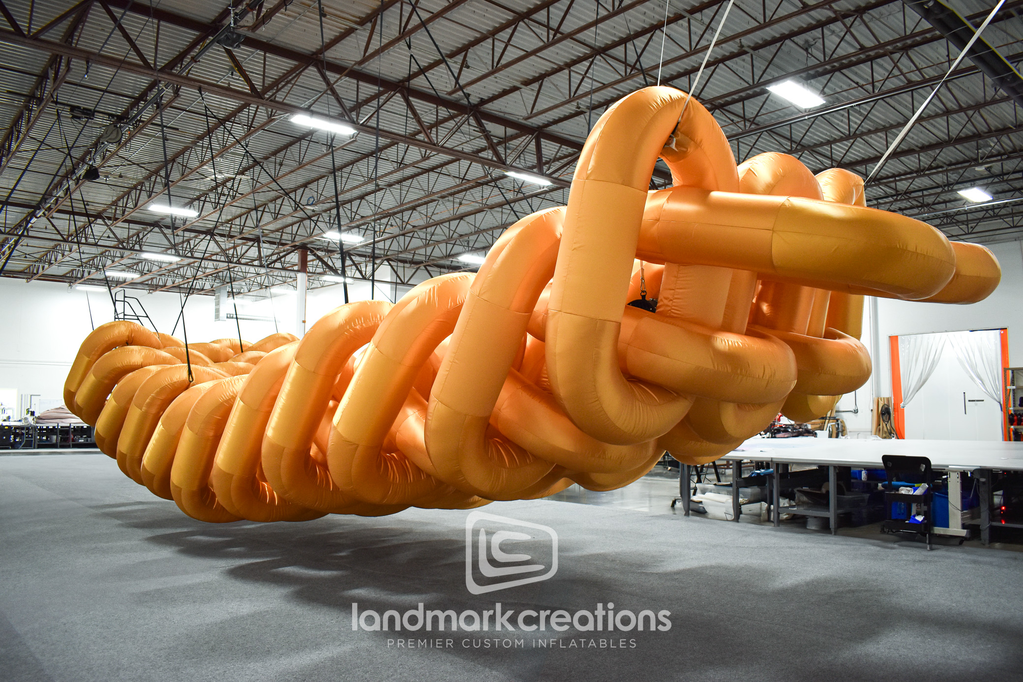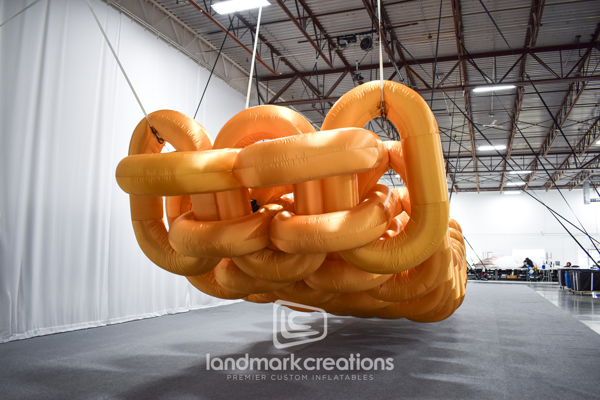 Commissioned by MASSIVart for the ROYALMOUNT shopping mall in Montreal, this custom inflatable art installation features two suspended chain link sculptures crafted from printed satin fabric. Designed to evoke the elegance of oversized jewelry, these pieces are displayed annually during the holiday season, enhancing the mall's festive atmosphere.