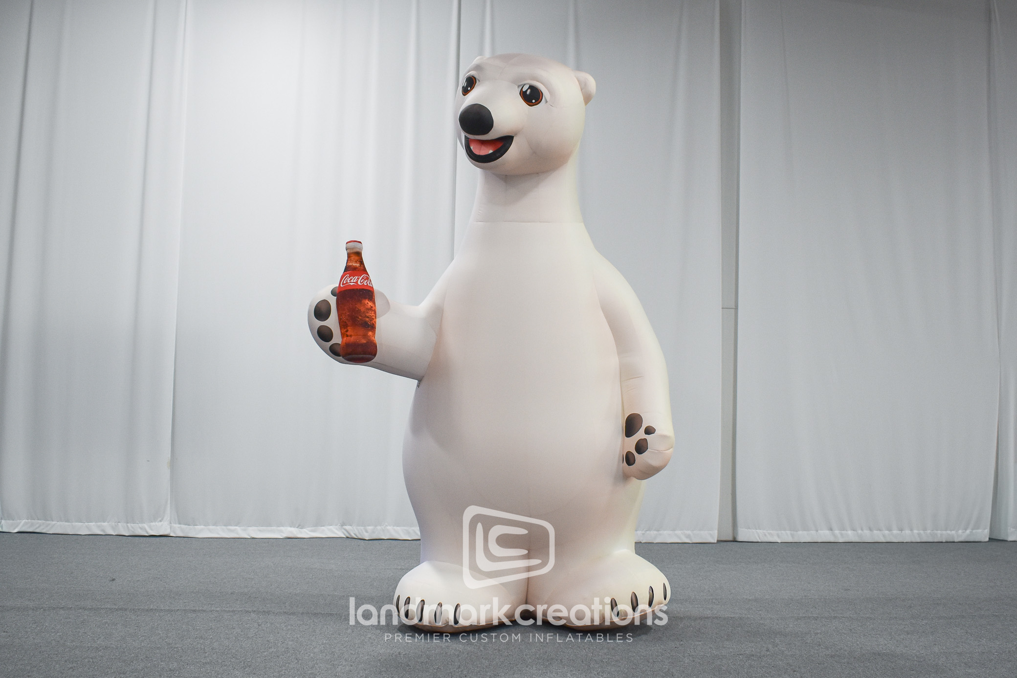 For the Fun Food Expo, Dedica Group introduced a 12-foot custom inflatable Coca-Cola polar bear mascot. Designed with Coca-Cola’s signature scarf and glass bottle, this standing character display became a bold visual centerpiece on the trade show floor. The inflatable created instant brand recognition, encouraged photo opportunities, and offered a memorable way to engage attendees in a busy exhibit environment.