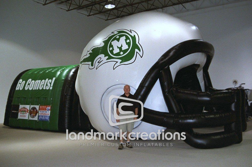 The Mason City Comets get fans stirred up when they charge through their custom inflatable football tunnel an exact replica of their football helmets!. Inflatable helmet tunnels are a focal point at sporting events, as all eyes are on the players ripping through it and onto the field.