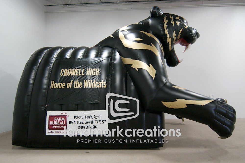 Players of the Crowell Wildcats football team in Texas make a wild entrance through this 14-foot mascot-topped inflatable sports tunnel during home games.