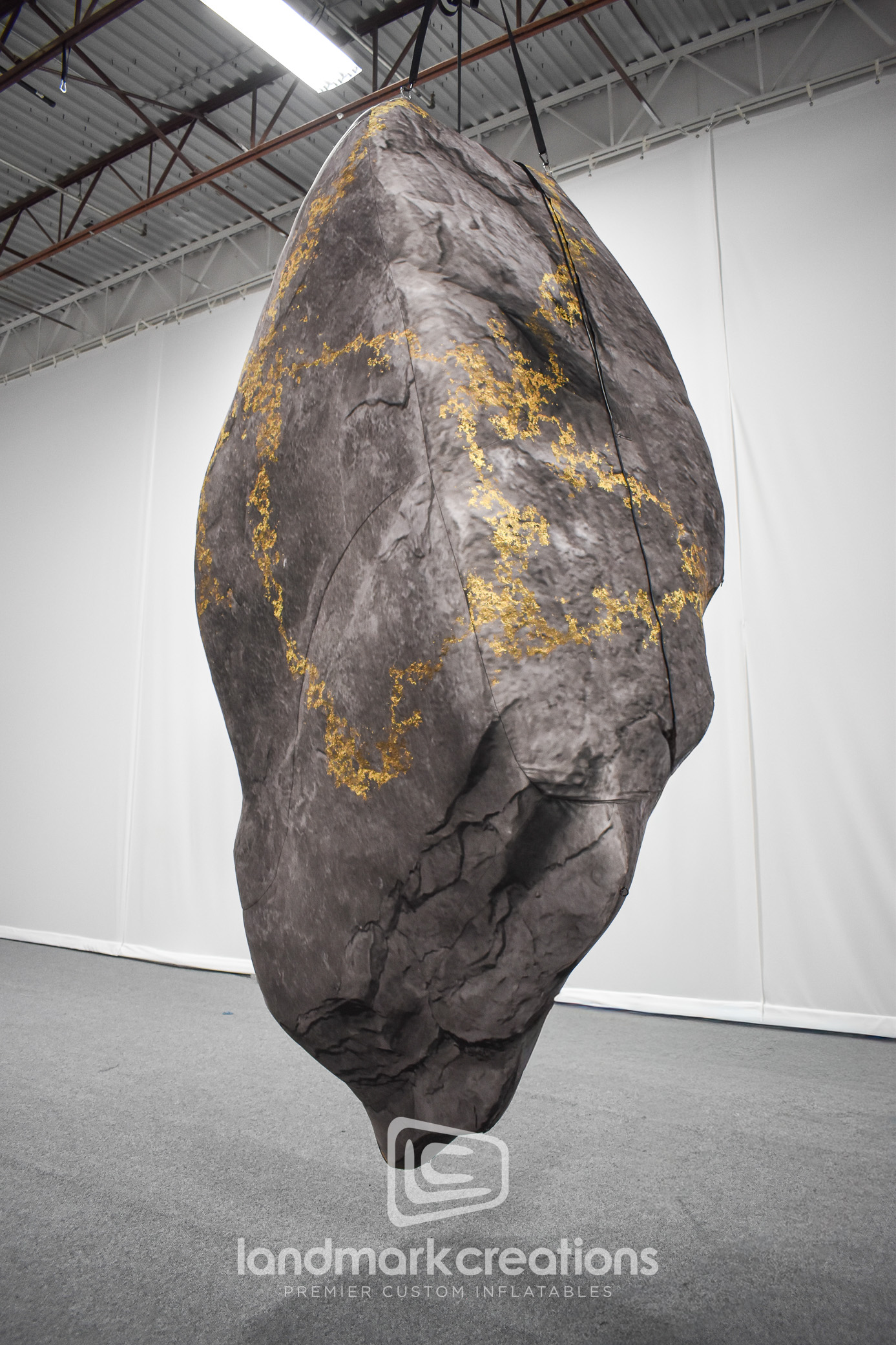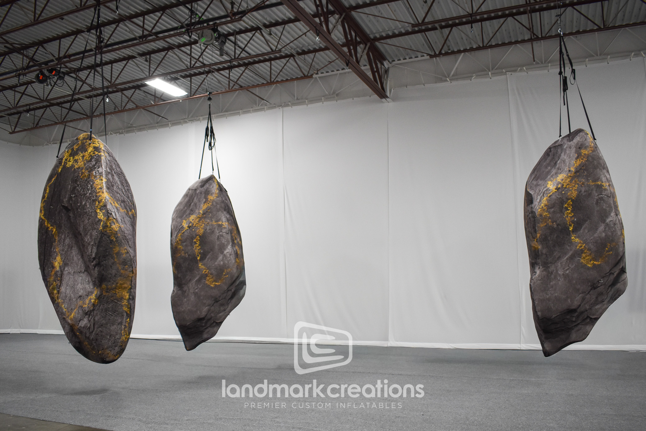 To support Vita Motus in creating immersive visuals for an international arena tour, Landmark Creations developed a set of three sculpted, inflatable boulders with a natural stone texture and metallic gold detailing. Designed to be suspended and in motion during performances, these lightweight, air-filled elements enhance both the stage aesthetic and touring logistics. Whether seen indoors or out, their size, texture, and fluid movement contribute to a transformative, otherworldly atmosphere on stage.