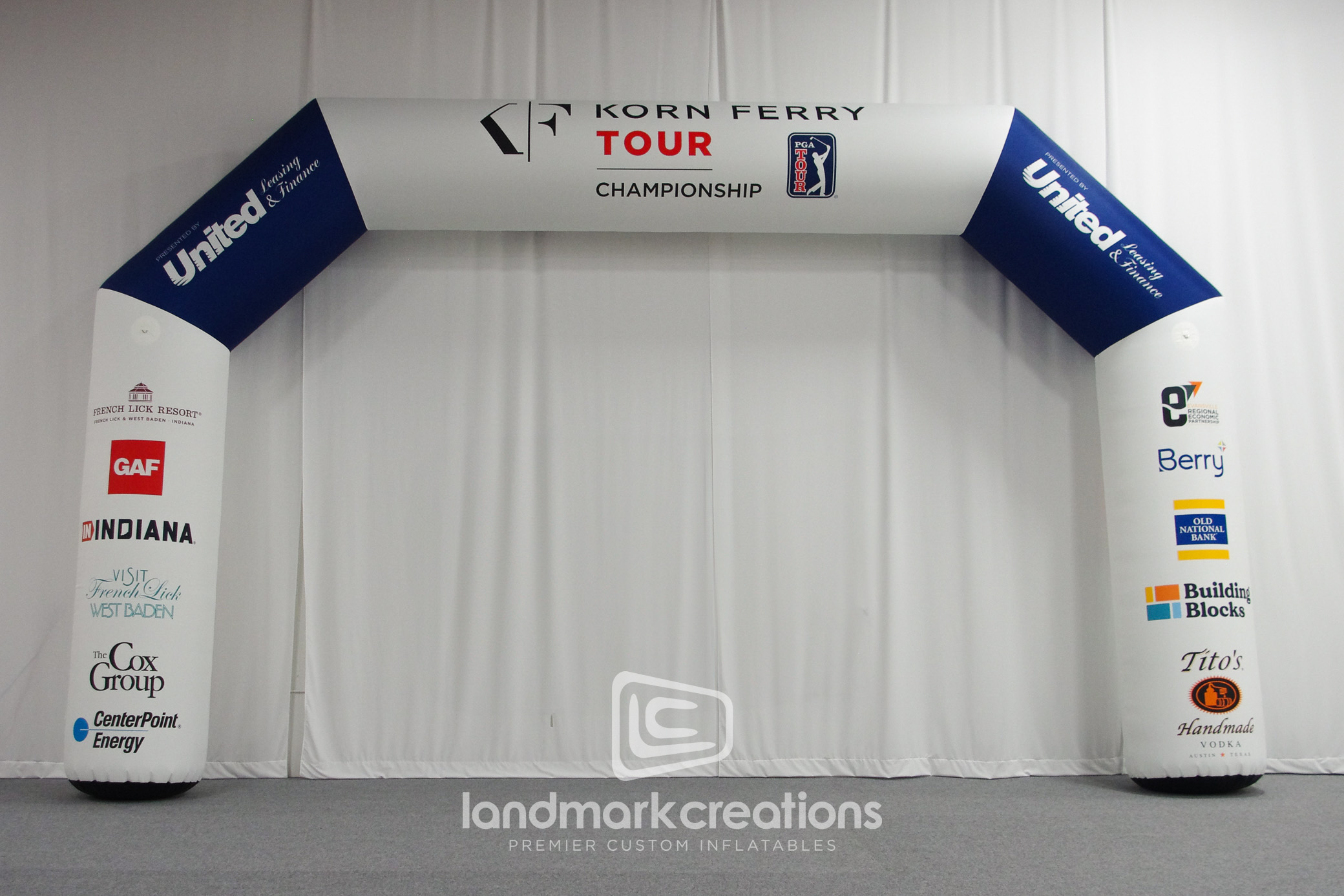 Landmark Creations crafted a custom navy blue and white arch for TOUR Vision Promotions, featuring six logos on each side and the golf tournament emblem at the top. This impressive archway served as the entrance to the Korn Ferry Golf Tournament at French Lick Resort in Indiana, elevating the event's visual appeal and brand presence.