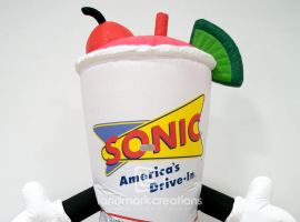 SONIC Drive-In restaurant uses this giant inflatable version of their coney dog mascot to greet visitors at grand opening events. Their inflatable coney dog mascot, with friendly smile and striped clothing, also helps promote franchise locations.