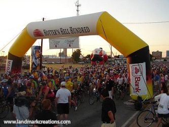 The Hotter 'N Hell bicycle race was originally created in 1982 by the Wichita Falls Bicycle Club as a way to celebrate Wichita Falls' 100-year anniversary. It is now the largest single day 100-mile bicycle ride in the nation attracting over 10,000 racers from all across the globe. In celebration of their 25th anniversary, the club wanted to do something truly spectacular for this year's race. That's why they teamed up with Landmark Creations, designer of inflatable mascots, arches and more.