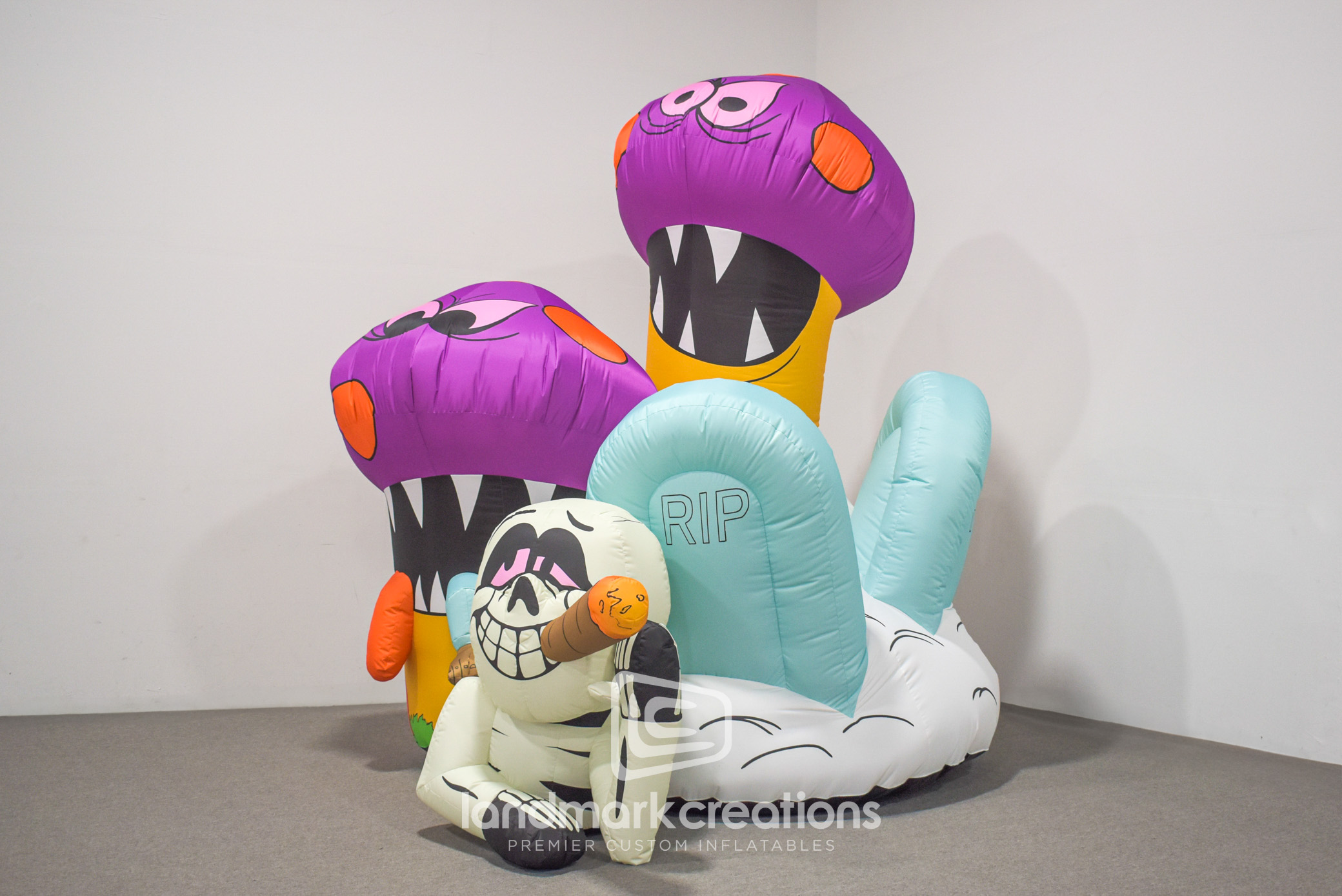 Landmark Creations crafted this custom Cannabis Shrooms Inflatable Display for The Smoker's Club. This whimsical and vibrant installation features a cartoon skeleton enjoying a smoke while being surrounded by playful mushrooms. Ideal for outdoor festivals and cannabis-themed events, this inflatable adds a fun and unique visual to any gathering, guaranteed to capture attention. Explore our inflatable characters and mascots to elevate your next event.