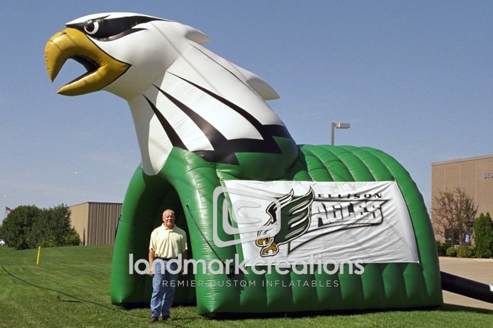 Ellison High School uses their mascot-topped inflatable sports tunnel to excite Eagle fans at football games.