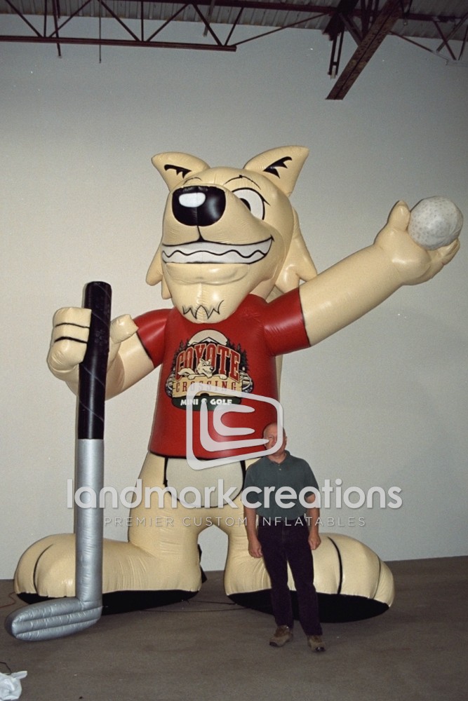 Inflatable mascots like Carol Stream Park District's giant coyote are a great way to drive traffic to grand opening events. With a friendly face and bright colored t-shirt this inflatable coyote mascot draws attention while making an emotional connection with children and adults alike.
