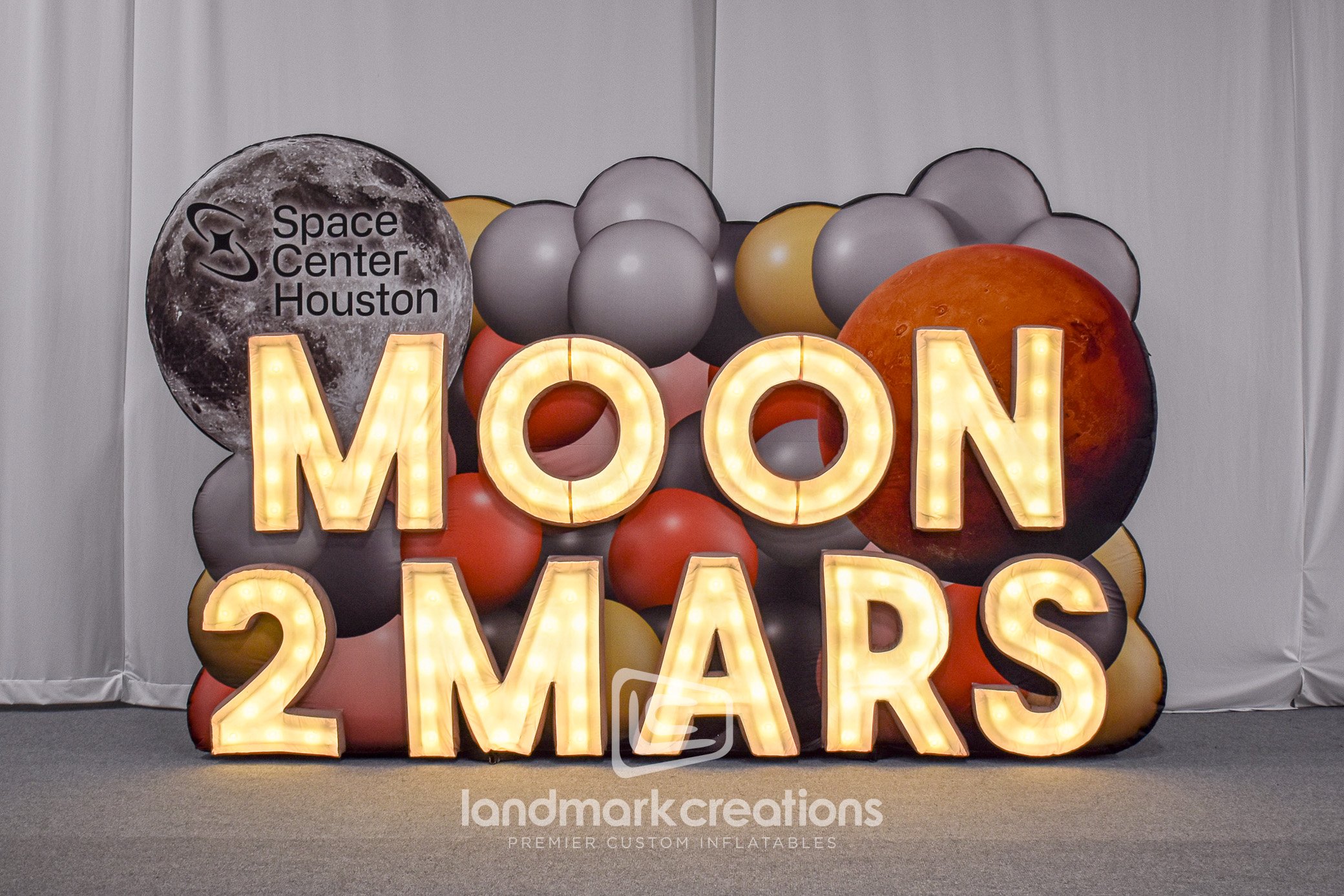 Landmark Creations designed the eye-catching "Moon 2 Mars" inflatable display for Space Center Houston's annual festival. This custom balloon display serves as both a photo backdrop and a marketing centerpiece, featuring marquee-style LED lights in bold lettering. Crafted to elevate event marketing, this reusable inflatable offers a memorable, larger-than-life experience.