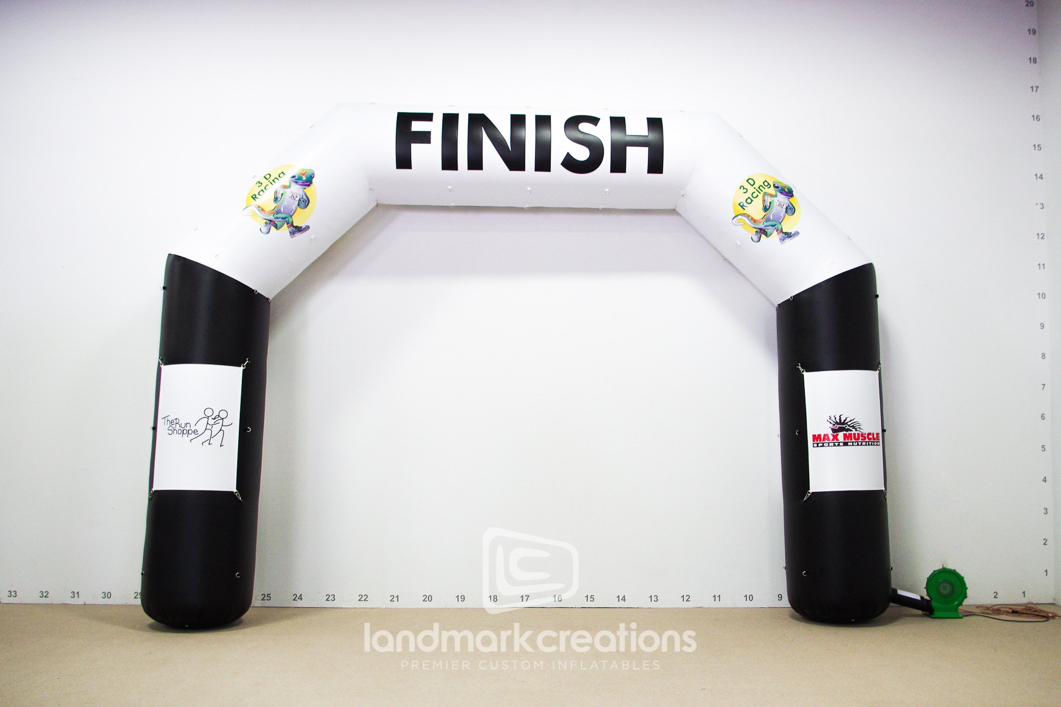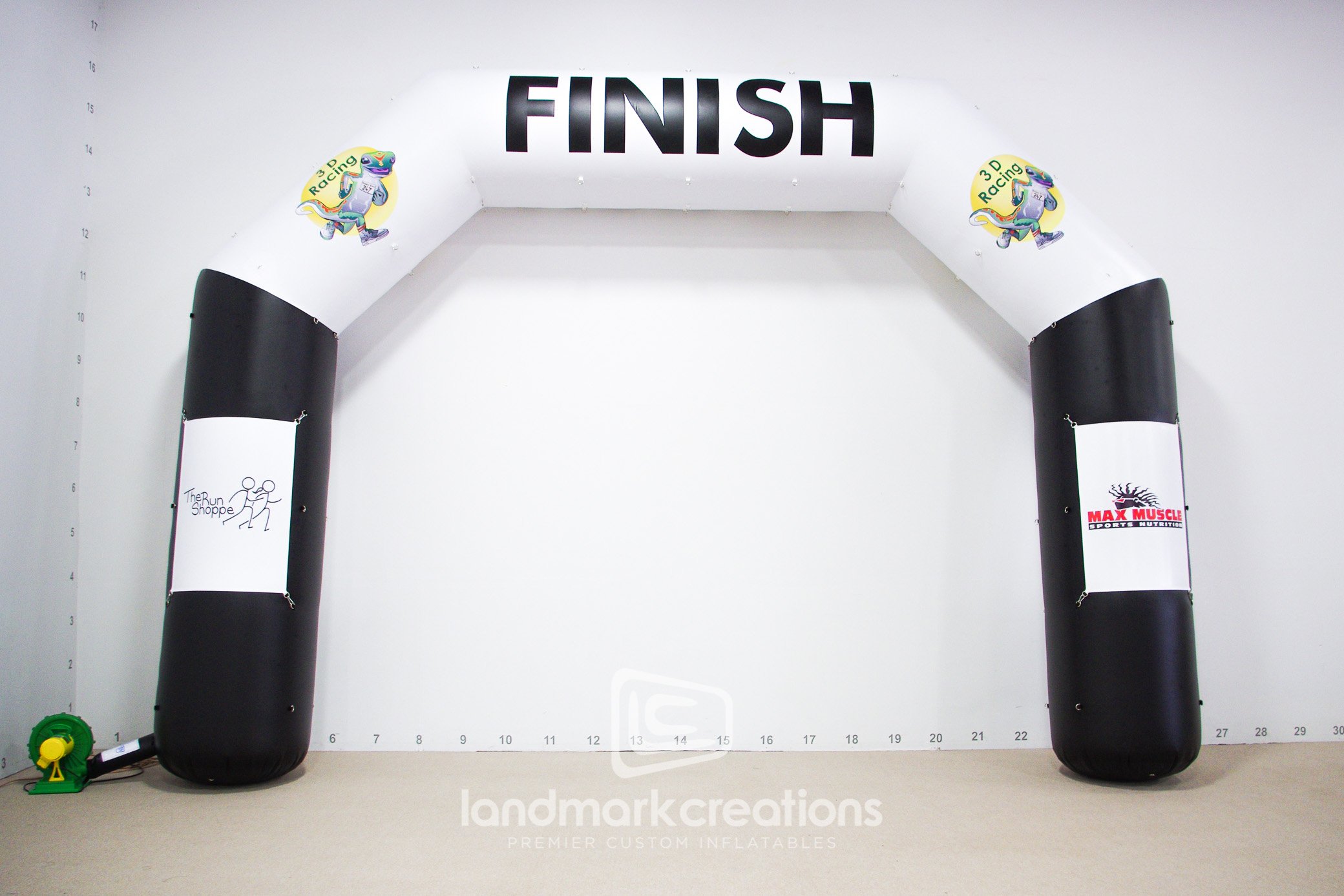 3D Racing, an event management and timing service company, inflates this custom-designed inflatable finish line at a variety of racing events. The inflatable archway is complete with d-rings for interchangeable sponsorship banners.