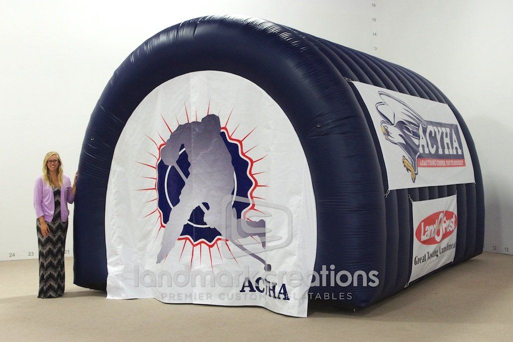 Armstrong Cooper Youth Hockey Association purchased this custom inflatable sports tunnel to use at football and hockey games. The traditional style sports tunnel has a removable backdrop banner that is used as a slap shot game at hockey events!