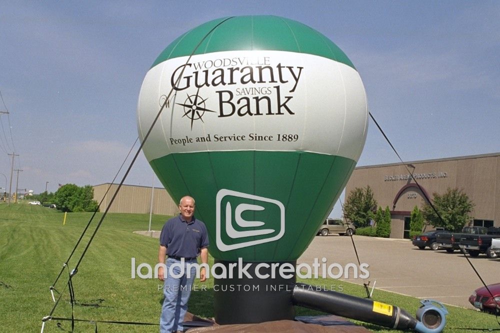 Woodsville Guaranty Savings Bank of New Hampshire attracts business with their custom hot air balloon shape. Their inflatable balloon is easily transported and used for weekend promotions at ten different locations.