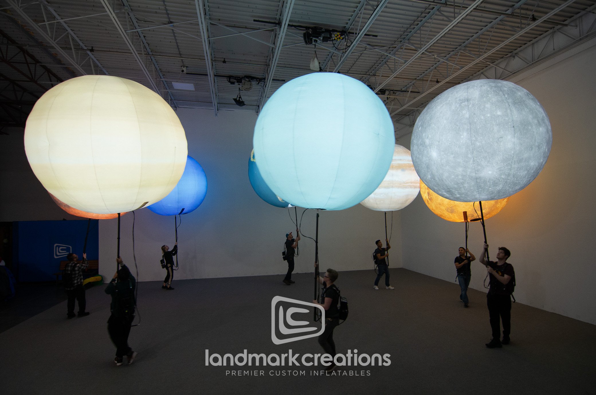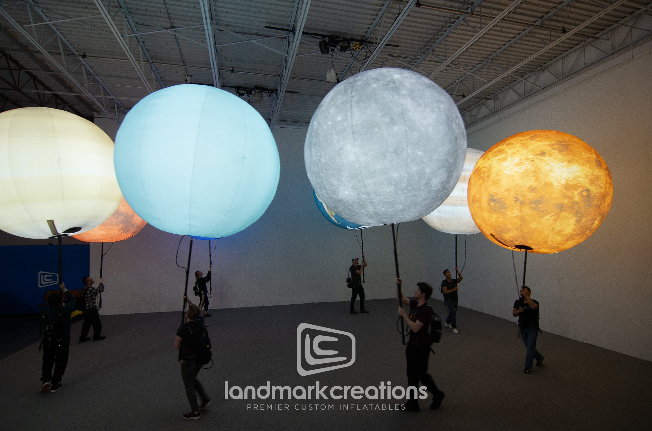 Kpop band BTS created a custom inflatable solar system to be used on stage for their performance of the song "My Universe" which they performed with the band Coldplay. The inflatable planets were internally lit and moved in "orbtis" by performers who suspended the giant orbs using a harness and pole system. Collectively, the glowing inflatable spheres dancing across the stage created an ethereal visual on tour.