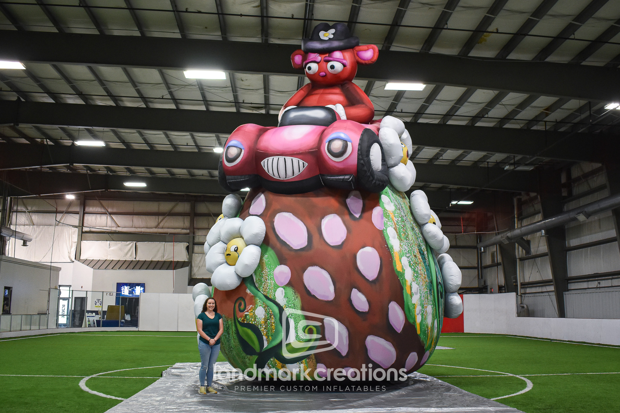 In collaboration with Art Production Fund and artist Alake Shilling, Landmark Creations brought Buggy Bear Loses Control in the Long and Winding Road to life as a 25-foot inflatable sculpture. Displayed outdoors in Los Angeles, this custom inflatable blends whimsy with scale, featuring a standing structure and three raised flower elements that help root the piece in its surreal, narrative world. Engineered for public display on museum grounds, this inflatable artwork invites passersby to engage with contemporary art in a bold and playful way.