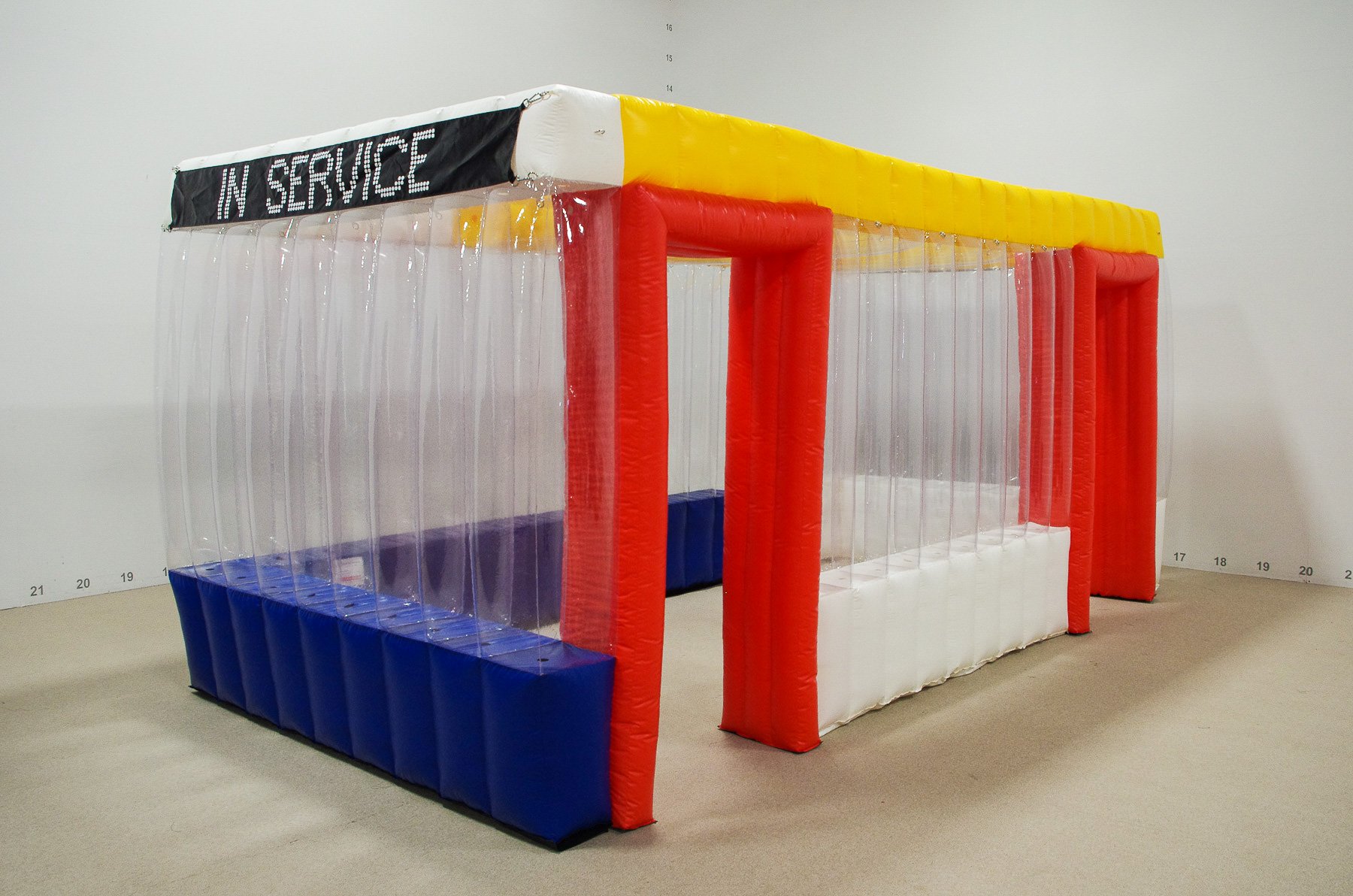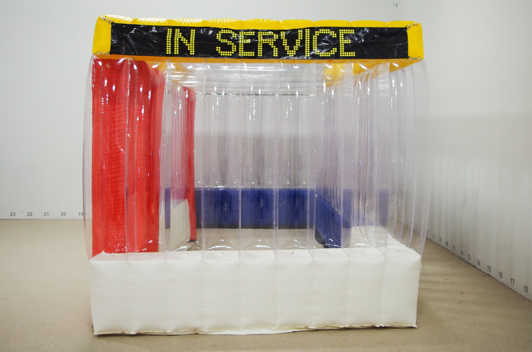 This inflatable bus shelter provides a unique space for bus riders to wait in, while exploring the role of transit in everyday life in Emily Stover’s 'In Service' bus stop pilot project.