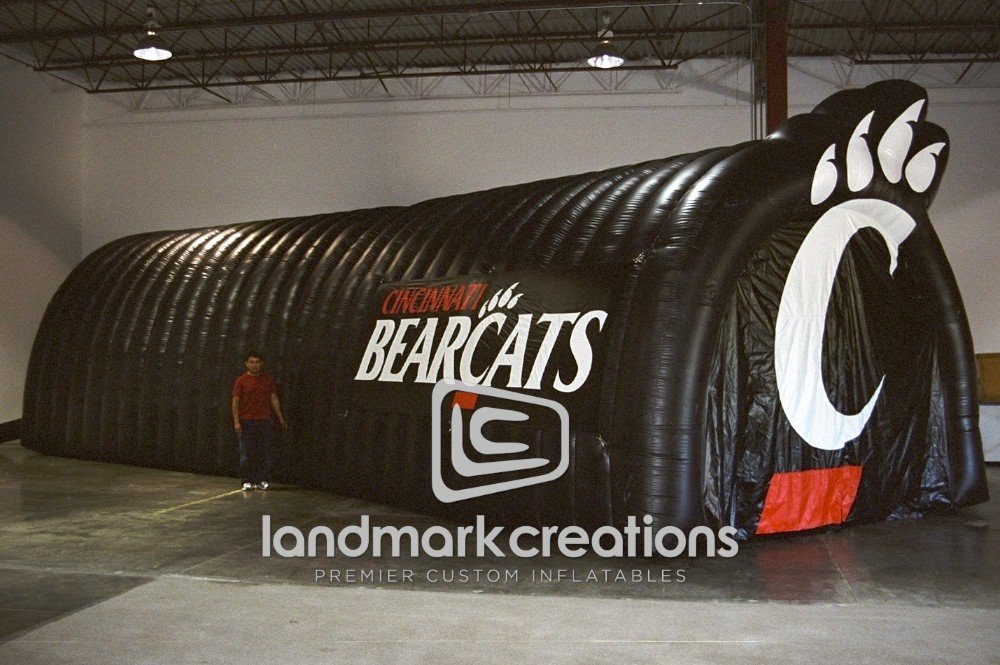 The Bearcats create extra excitement by bursting onto the field through the shrouded entrance of their inflatable sports tunnel. With the angle of the football tunnel, the Bearcats can run directly onto the field and straight toward the other team's bench.