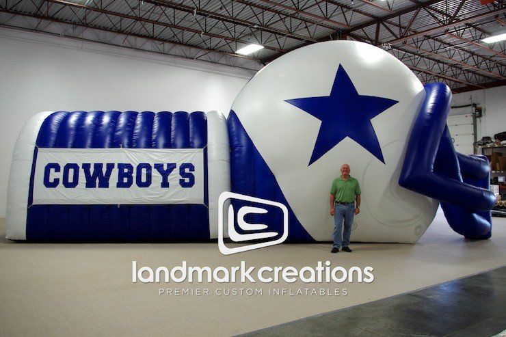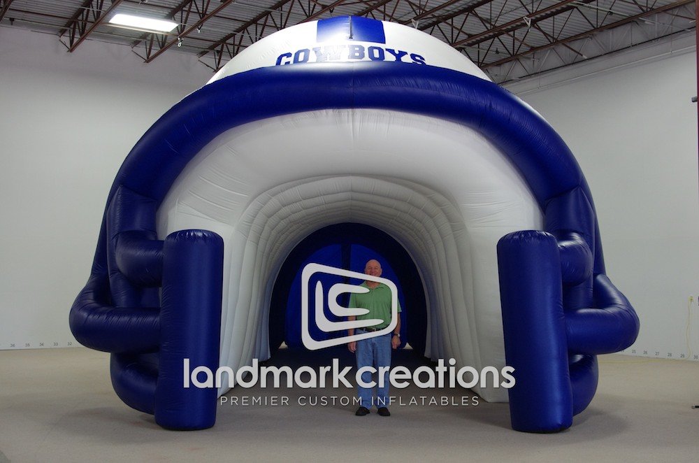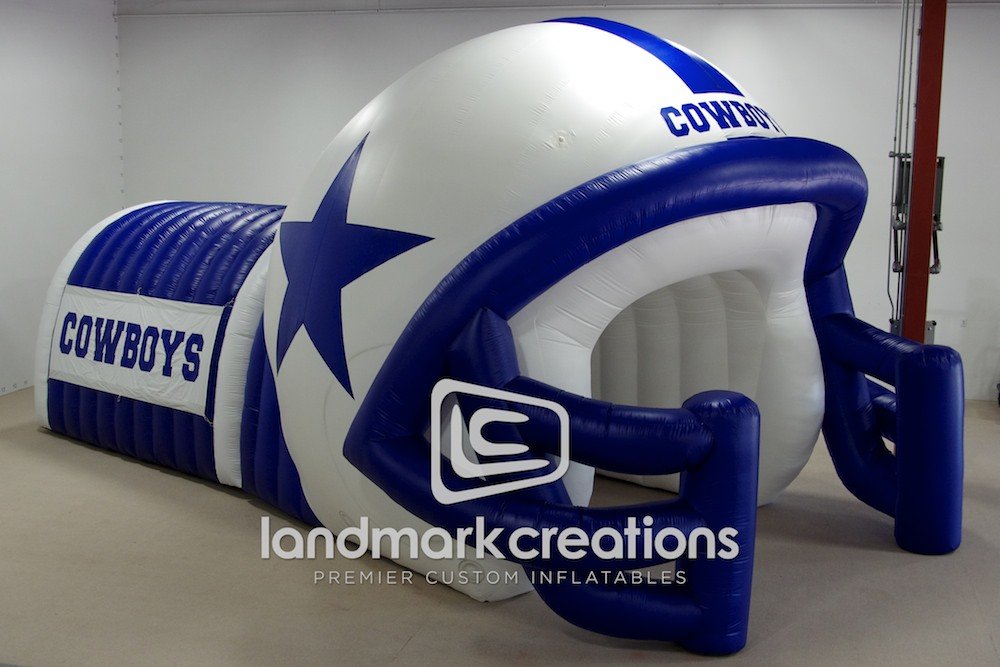 Looking to make a statement on the football field? This inflatable sports tunnel for the Cowboys included a massive helmet and additional tunnel extension with banners, easily grabbing attention wherever it is inflated.