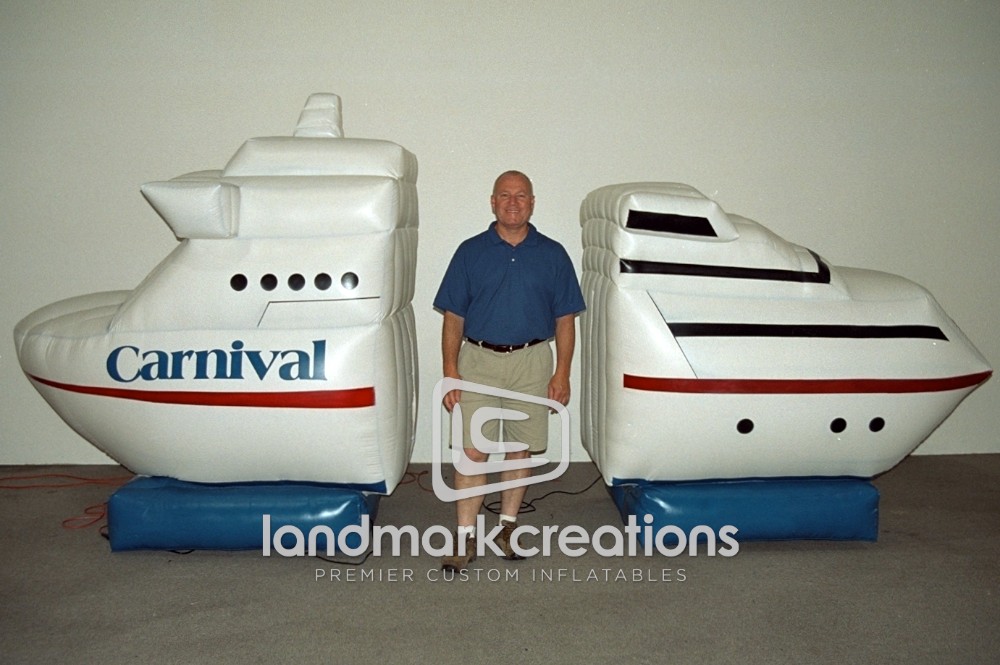 Carnival Cruise uses their inflatable cruise ship prop to welcome vacationers on board during a stage production. Inflatable stage props are perfect for traveling shows and mobile entertainment. Easy to inflate, deflate and a breeze to pack.