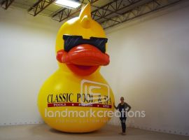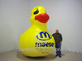 This inflatable character can be seen outside of DJ's Express Car Wash advertising $3 car wash and other special offers. The inflatable duck has ample space for interchangeable advertising banners.