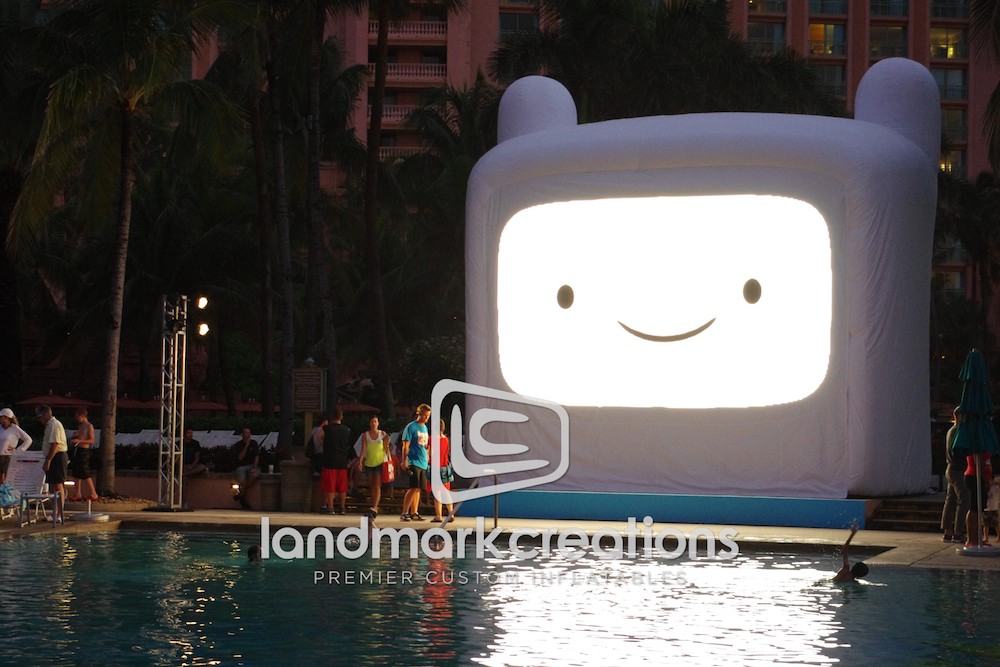 To promote the Adventure Time series, Cartoon Network created a giant, custom LED video screen shaped as a main character's head for their Dive-in Movie event at The Atlantis Resort.