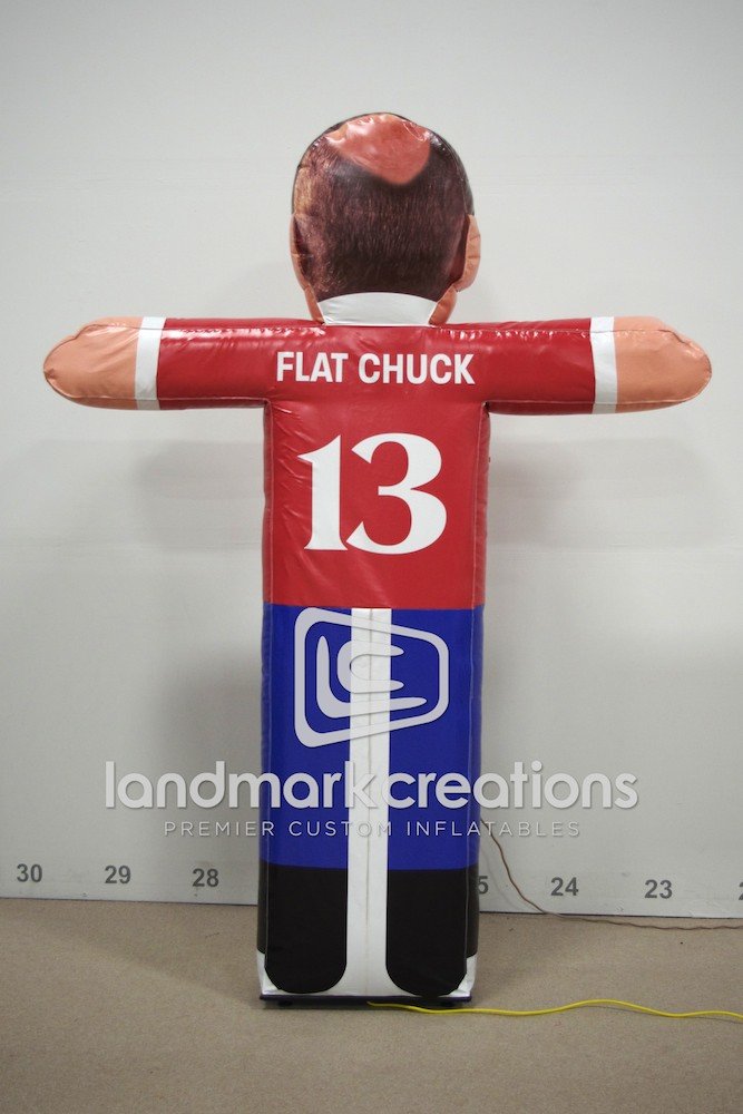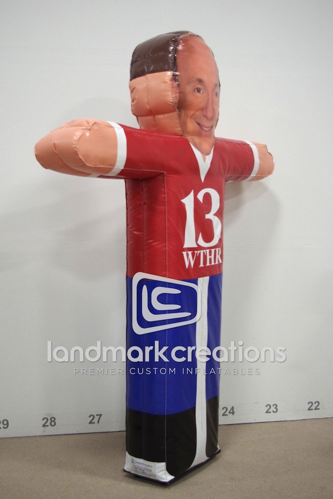 This inflatable caricature of Flat Chuck is used to promote Chuck Lofton, weatherman for Eyewitness News Sunrise in Indiana. Inflatable Flat Chuck travels around the world making connections and creating photo opportunities for station viewers.