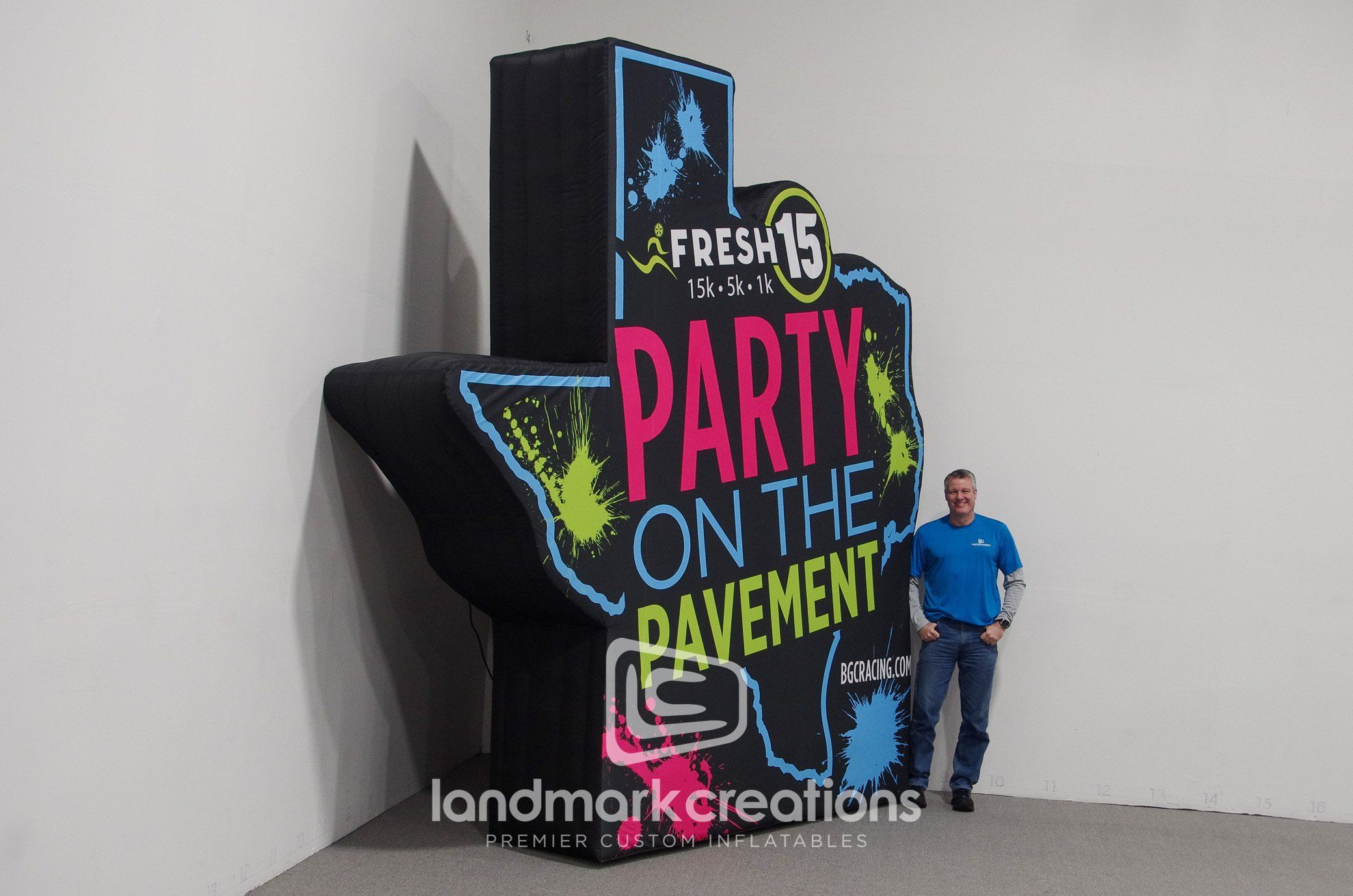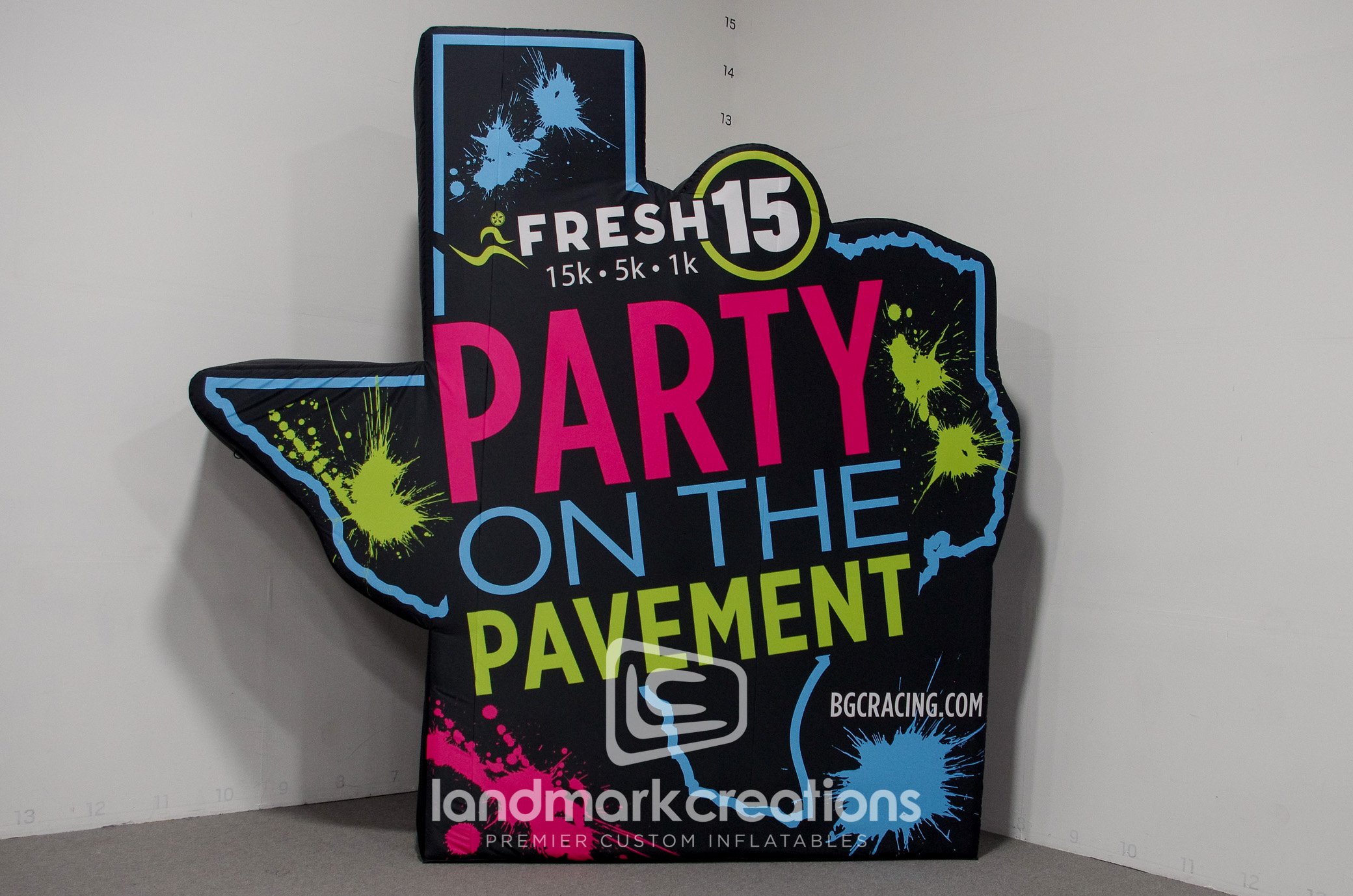 With its neon colors and Texas shape, BGC Racing’s custom inflatable billboard adds visual flare to their Party on the Pavement at the FRESH 15 race event.
