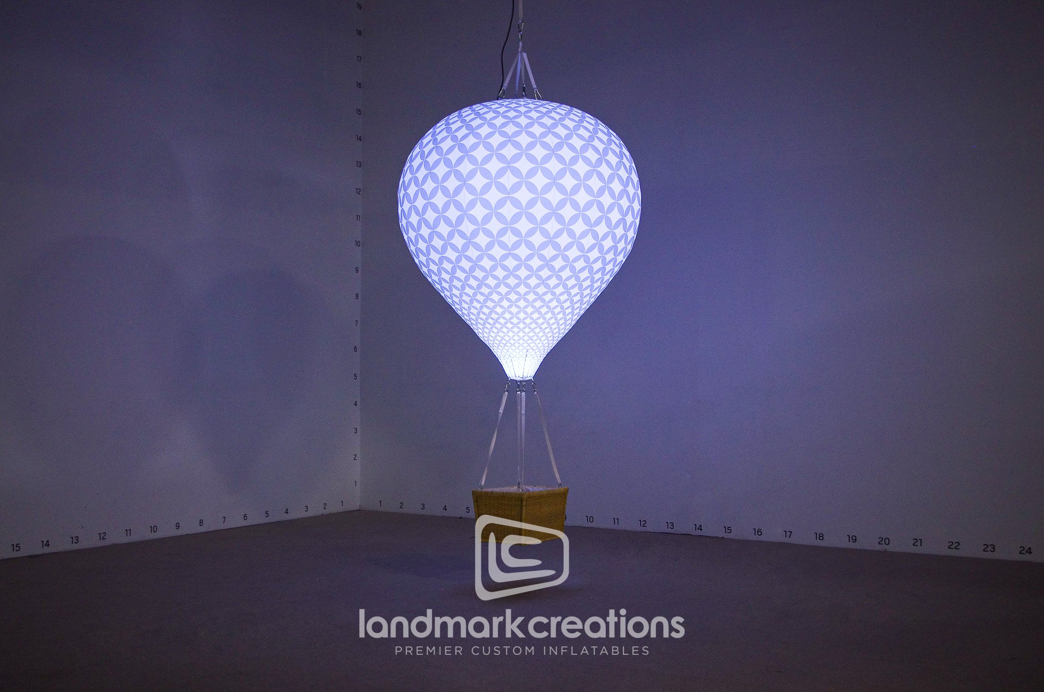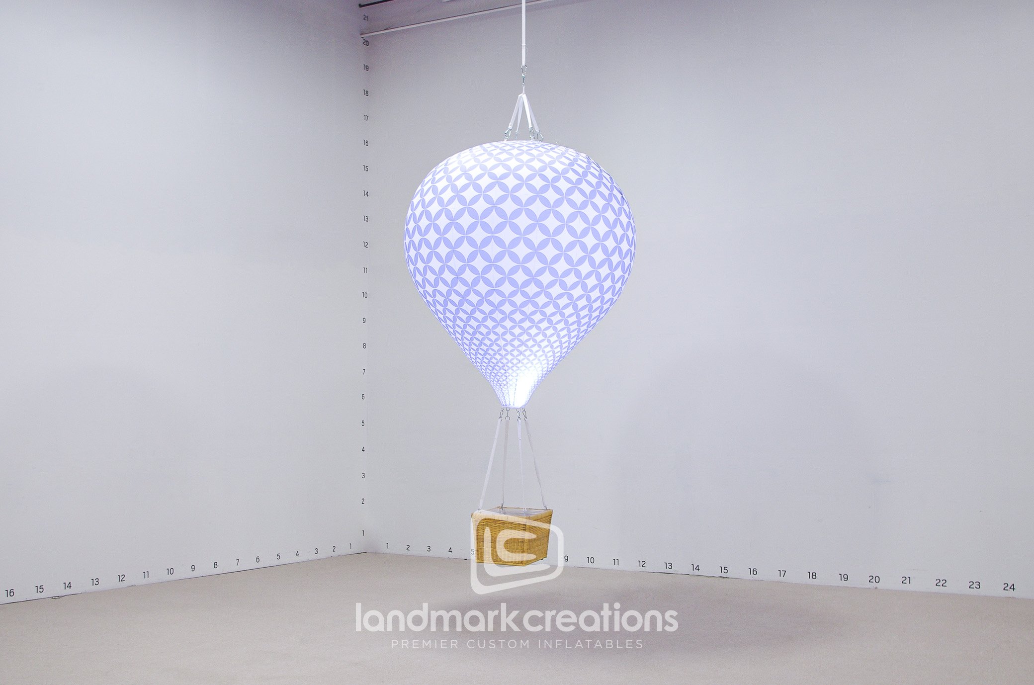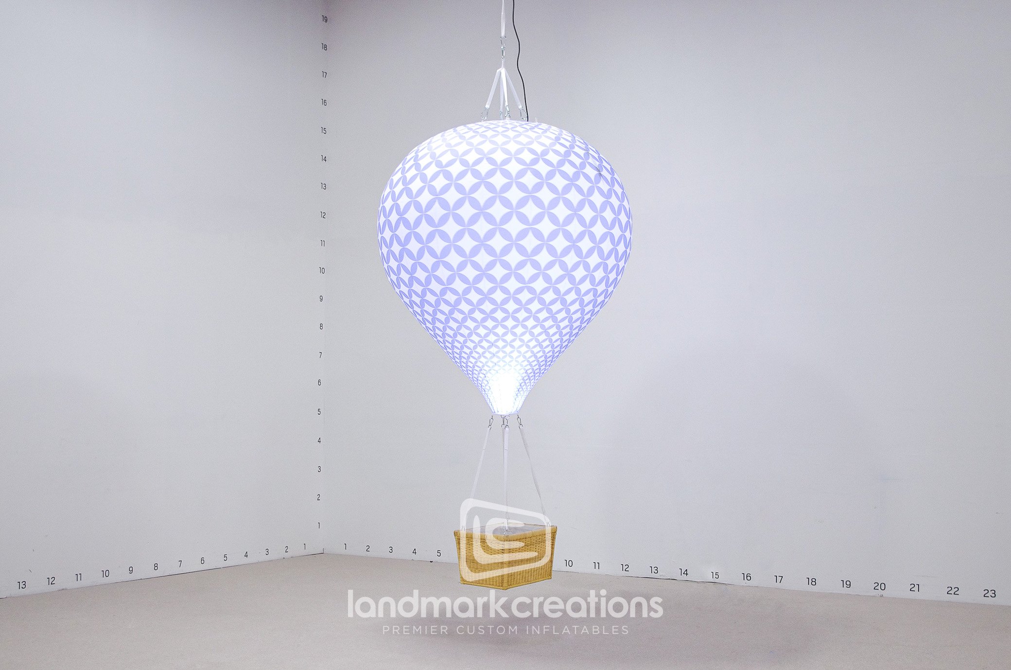 Hot air balloon shapes evoke a feeling of whimsy and adventure. The Syndicate Society created a set of geometric patterned inflatable hot air balloon replicas for use in event spaces. Inflatable shapes be created to hang or be free standing, including a variety of basket and internal lighting options for almost any brand or theme.
