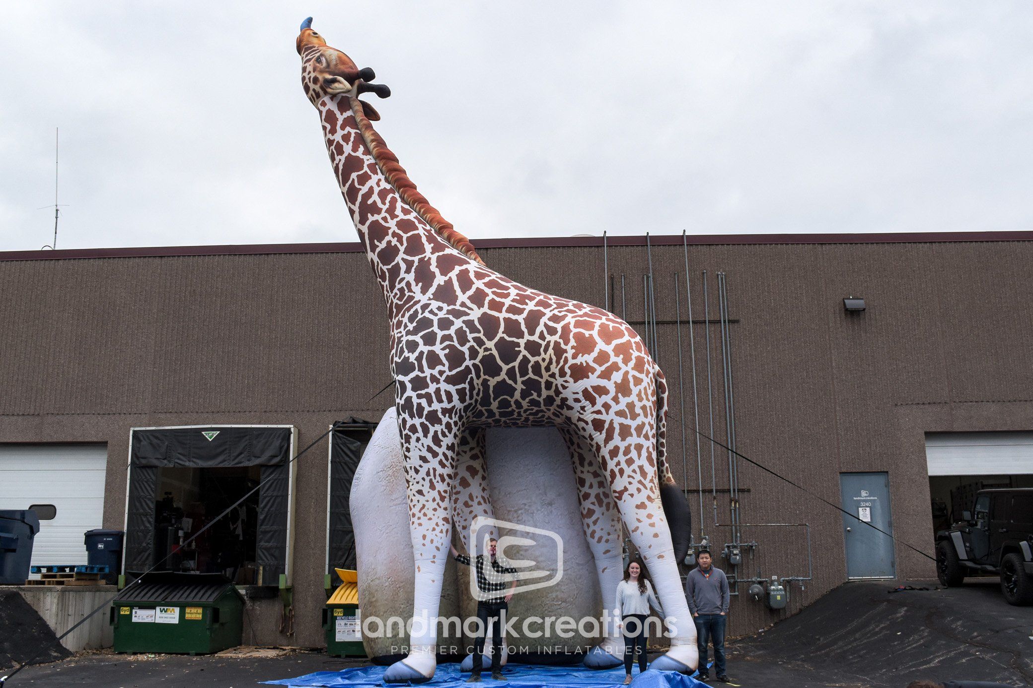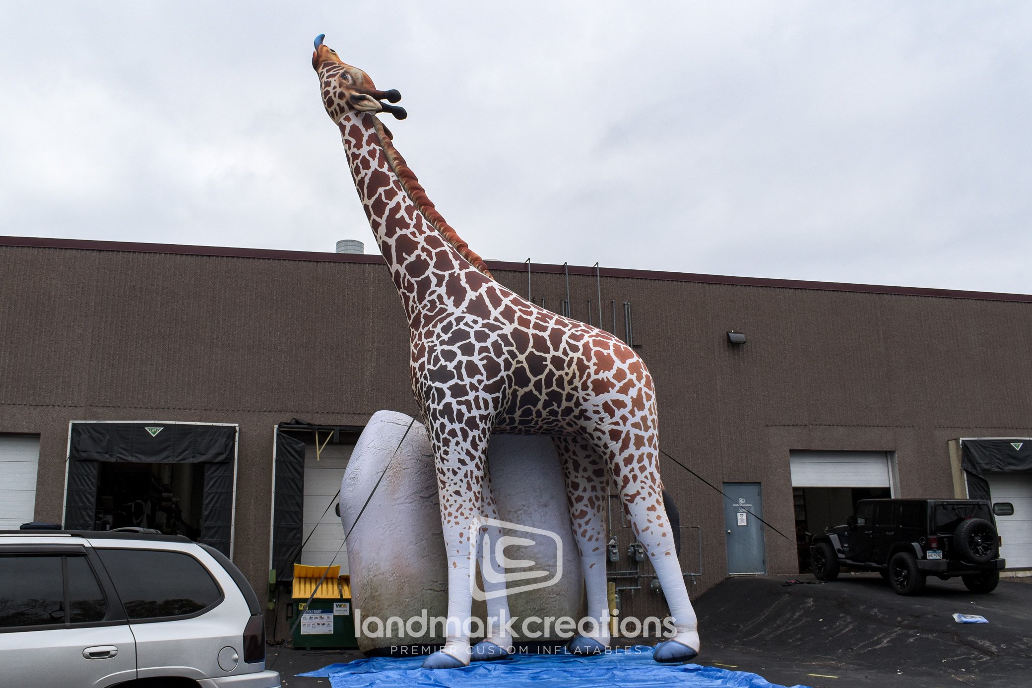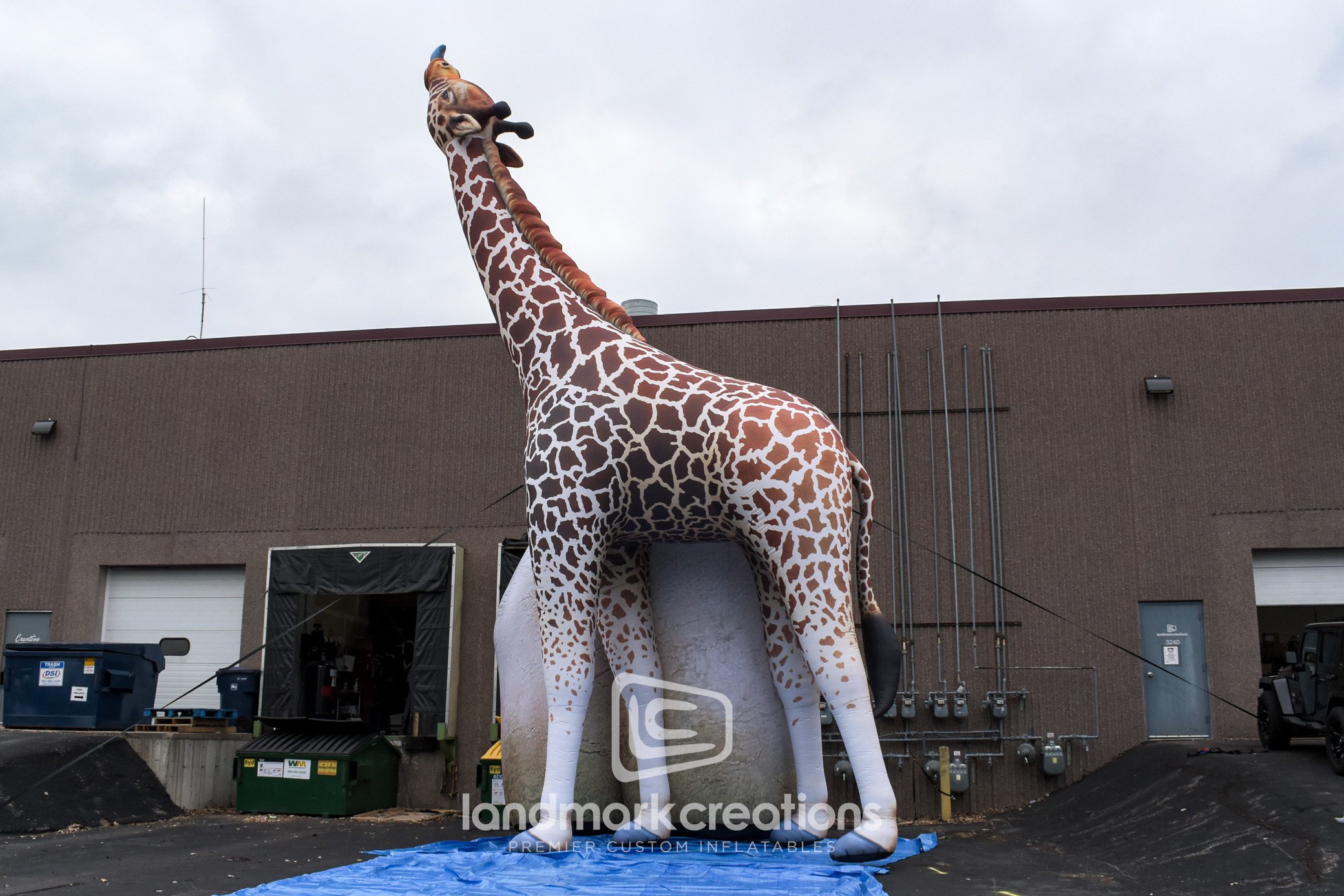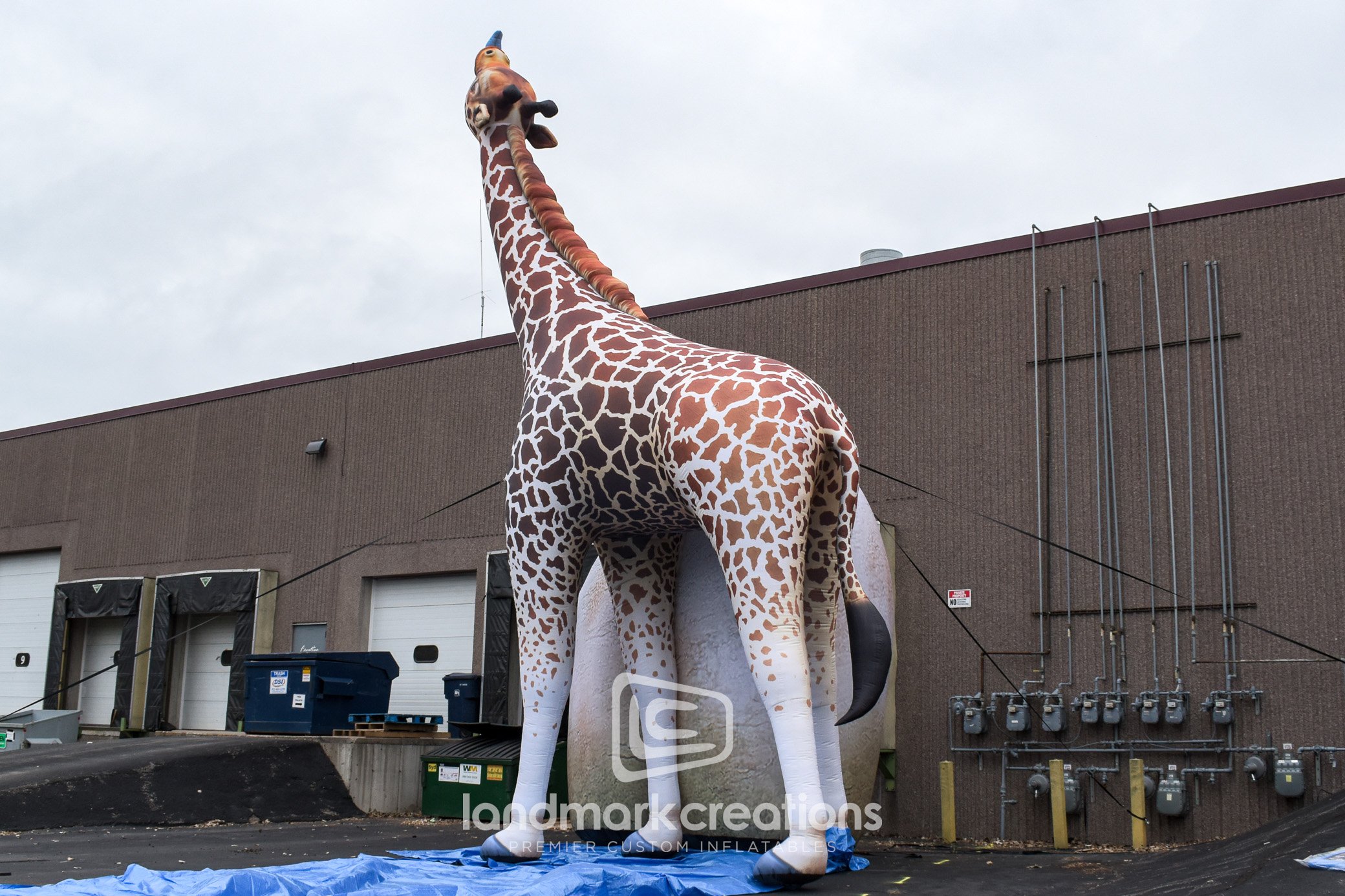 This single giraffe inflatable display was created as part of the Virginia Zoo's "ZooLumination" winter event. At 36 feet tall and internally lit, this giant giraffe replica creates a visual spectacle for guests, especially when it is inflated near the zoo's inflatable giraffe pair.