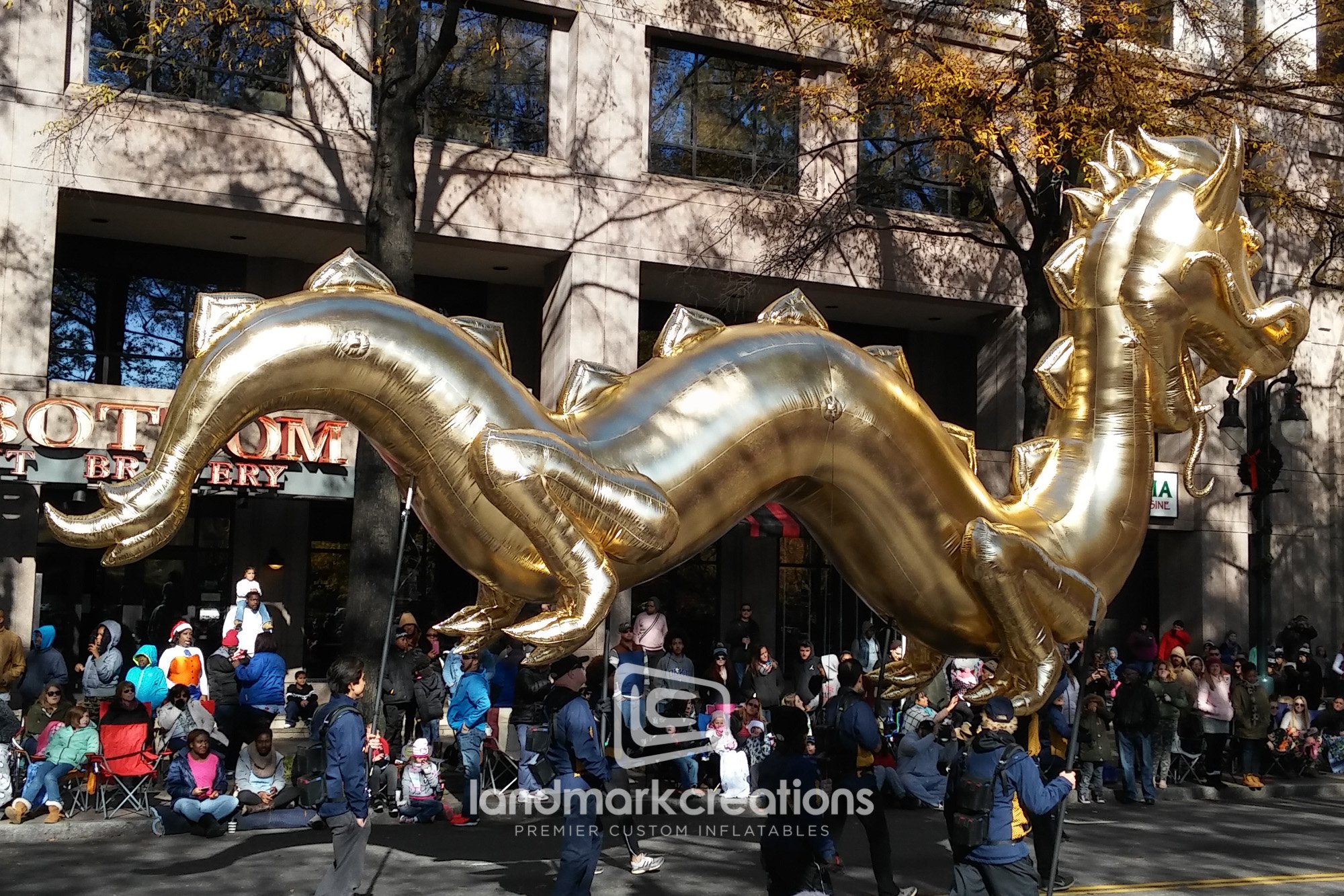The Charlotte Thanksgiving Parade dazzles the crowd with a giant, golden dragon inflatable. Carried by six people, this metallic dragon is both eye-catching and memorable.