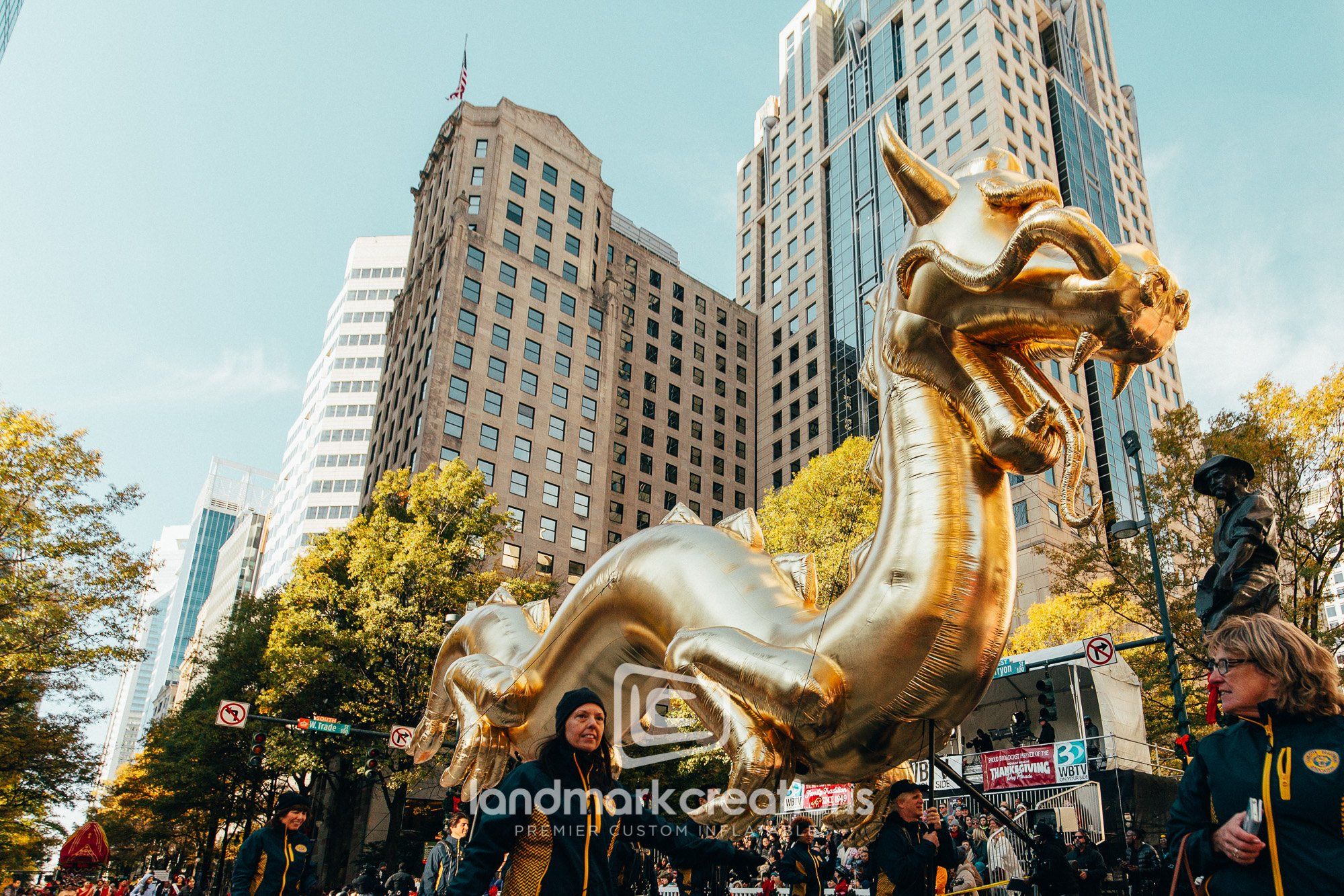 The Charlotte Thanksgiving Parade dazzles the crowd with a giant, golden dragon inflatable. Carried by six people, this metallic dragon is both eye-catching and memorable.