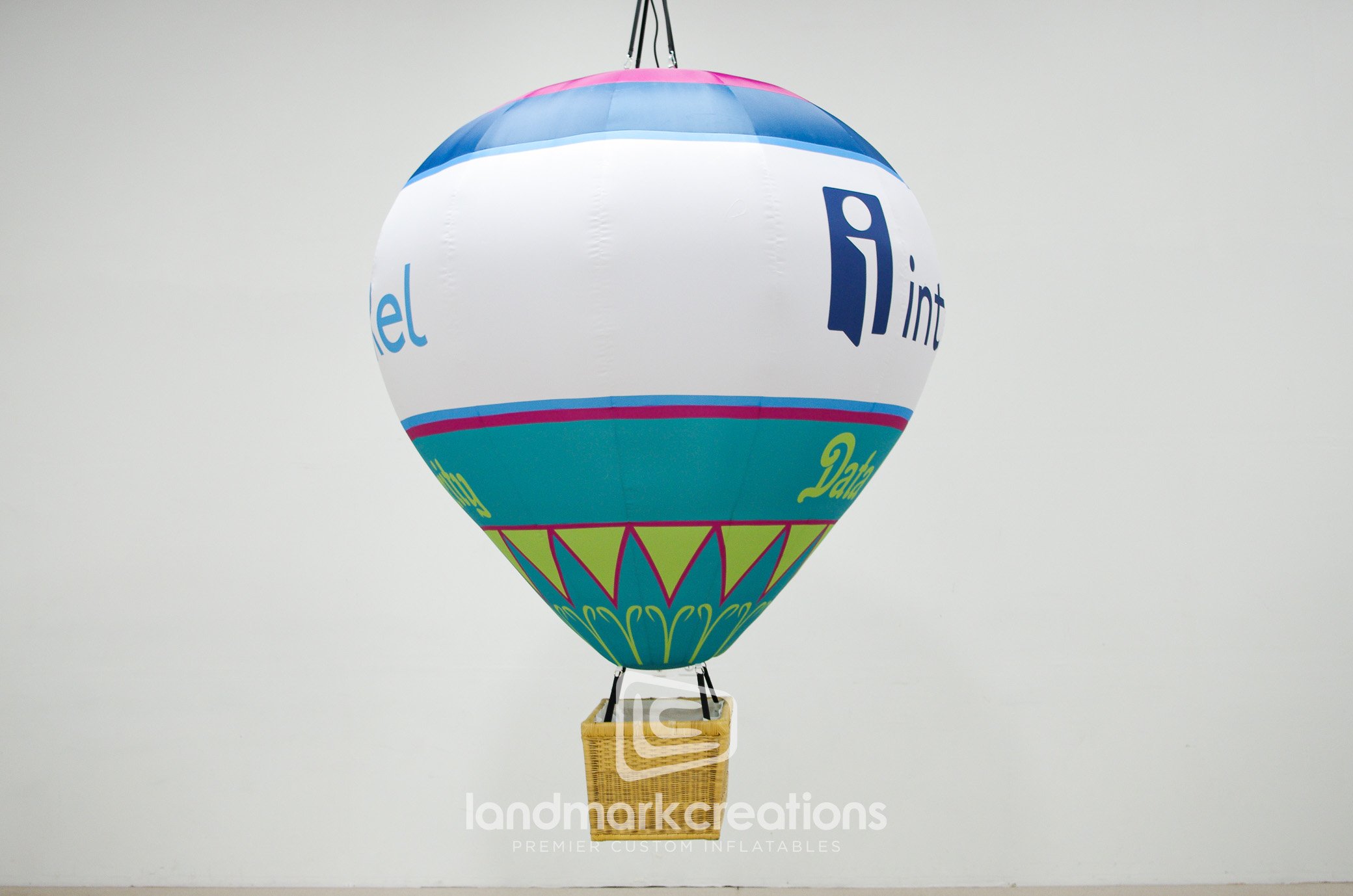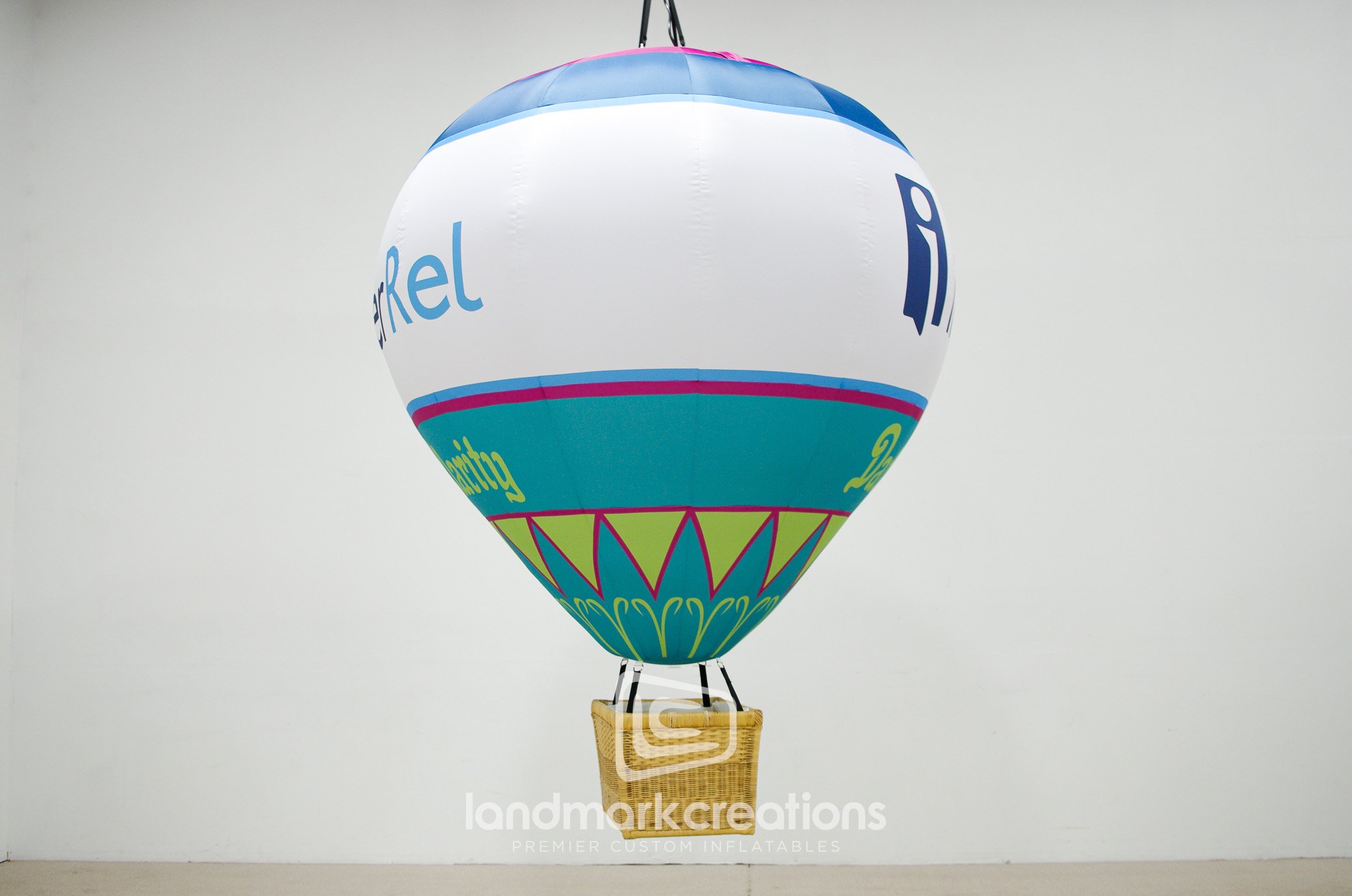 InterRel suspended this whimsical inflatable hot air balloon replica to catch attention at indoor events. Scaled-down hot air balloon replicas are perfect for organizations that have existing hot air balloons as part of their branding. They can also include internal light systems and a variety of basket options depending on your needs.