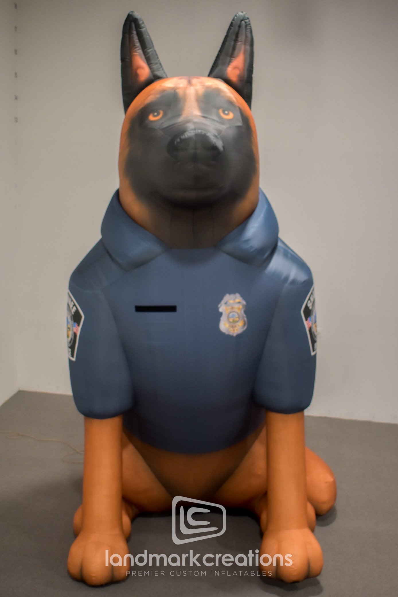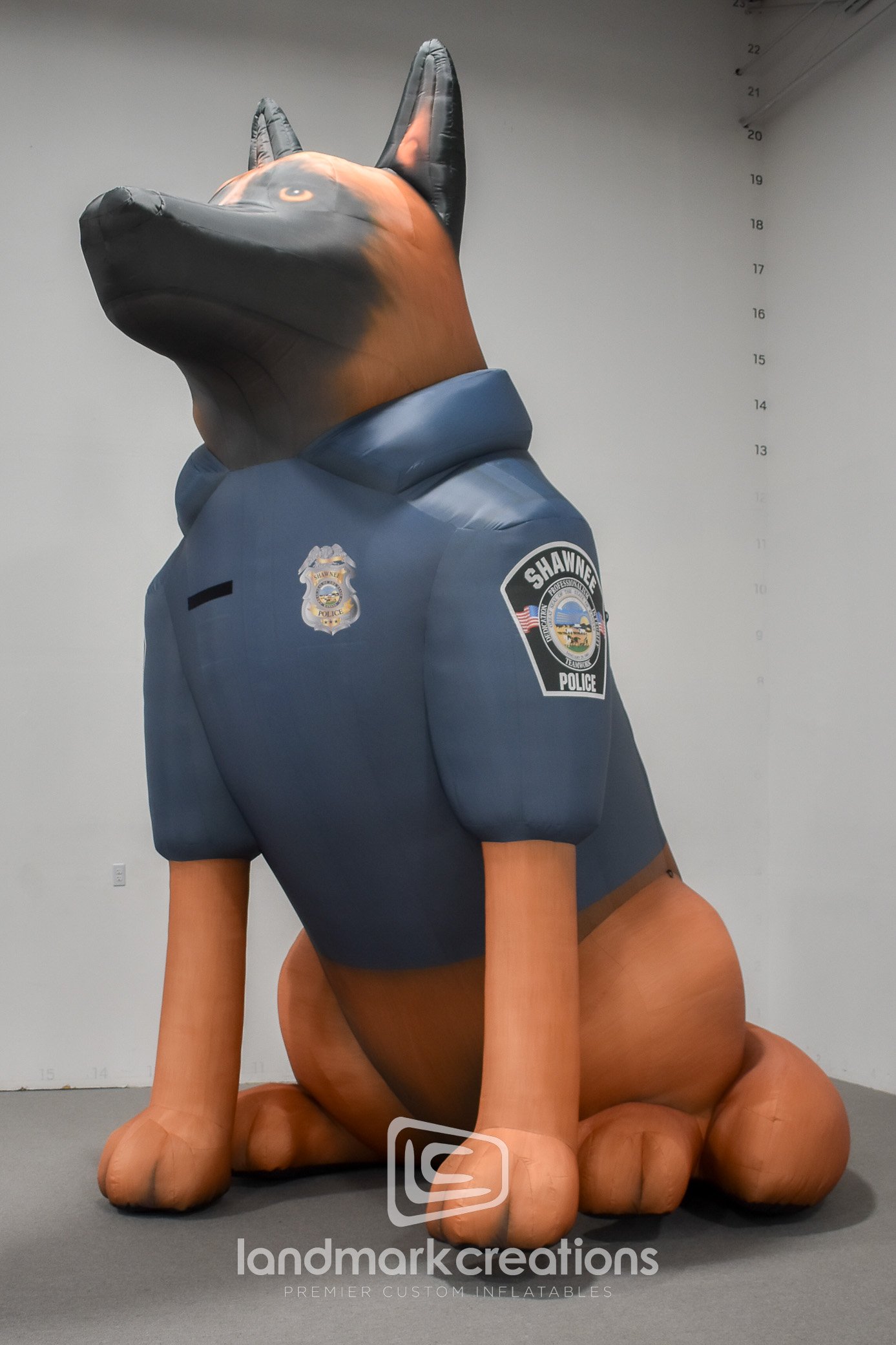 This custom inflatable police dog was modeled after an actual working dog for the Shawnee Police Department. Landmark can customize your inflatable display with specific fur markings and uniform badges based on your department's specific working dogs. Inflatables are easy to set-up and transport, making them perfect for engage with the community at special events.