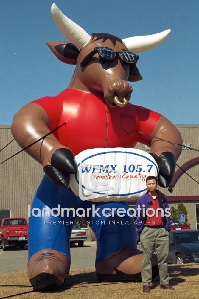 This custom inflatable bull mascot, complete with sunglasses and nose ring, stands tall at radio remotes and community marketing events to represent radio station WFMX.