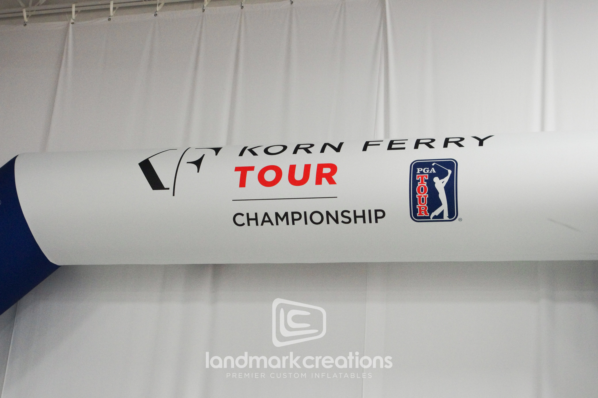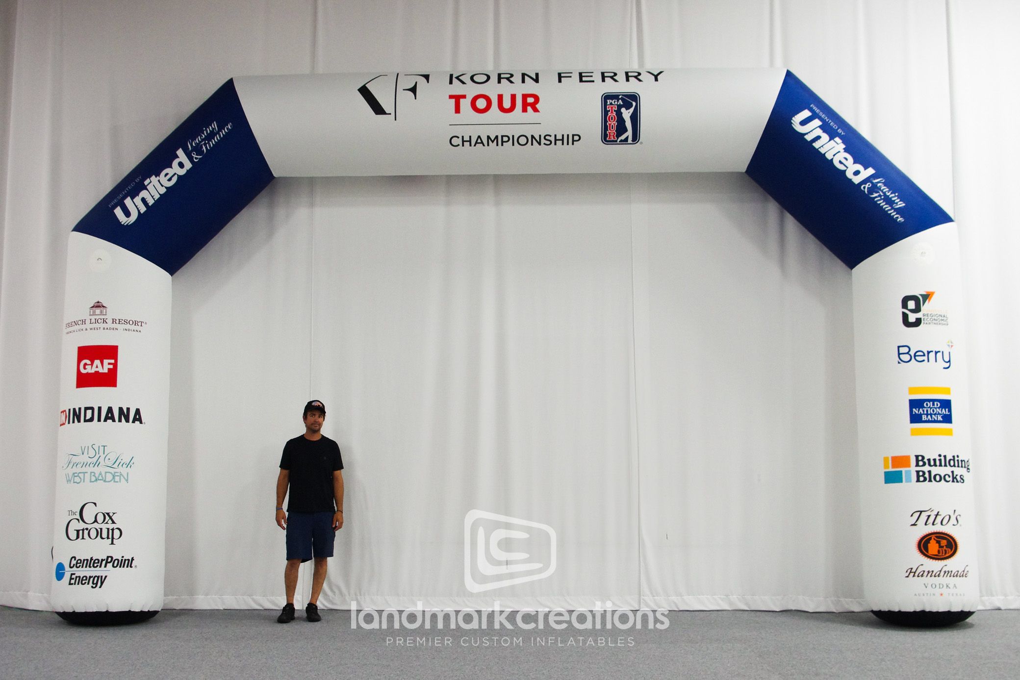 Landmark Creations crafted a custom navy blue and white arch for TOUR Vision Promotions, featuring six logos on each side and the golf tournament emblem at the top. This impressive archway served as the entrance to the Korn Ferry Golf Tournament at French Lick Resort in Indiana, elevating the event's visual appeal and brand presence.