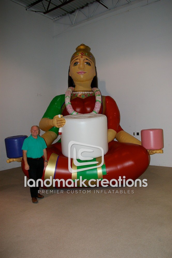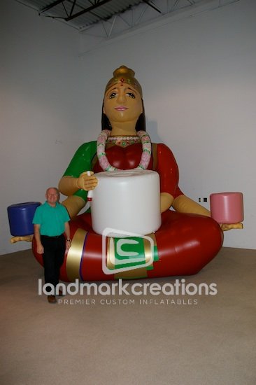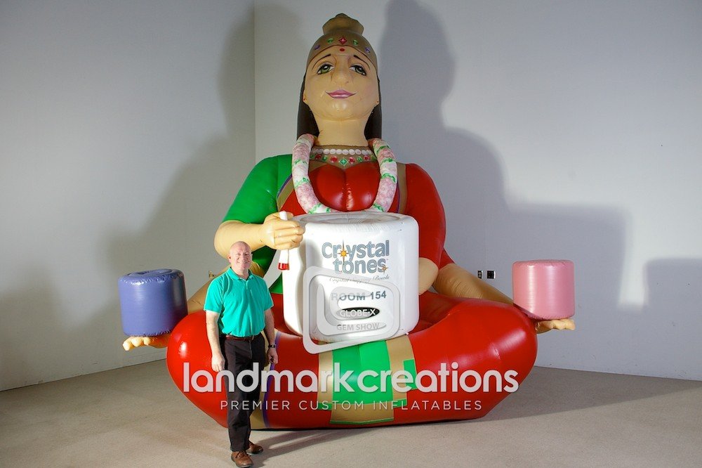 Crystal Tones, a crystal singing bowls manufacturer, uses their inflatable Lakshmi, the Hindu goddess of wealth, to attract the attention of potential distributors at trade shows like the Globe-X Gem Show.