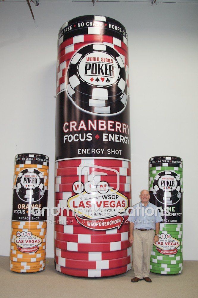 Earth Beverages used inflatable to promote the launch of a custom branded line of energized cocktail mixers during the 2010 World Series of Poker tournament. Full digital printing and size of these inflatable product replicas helped attract lots of attention at the event.