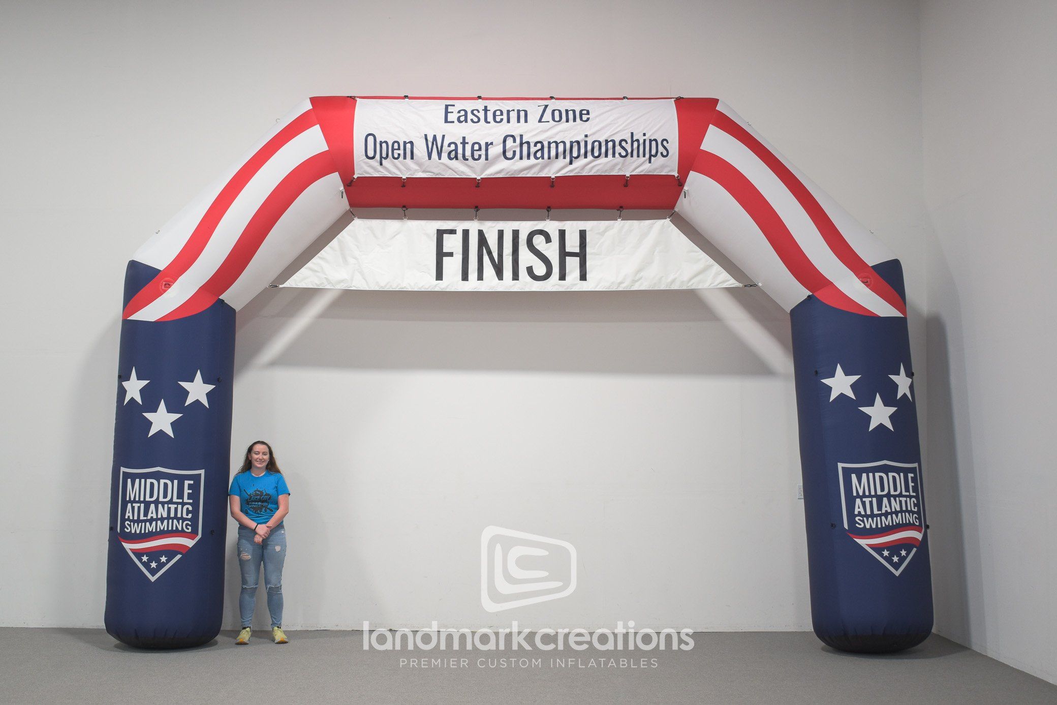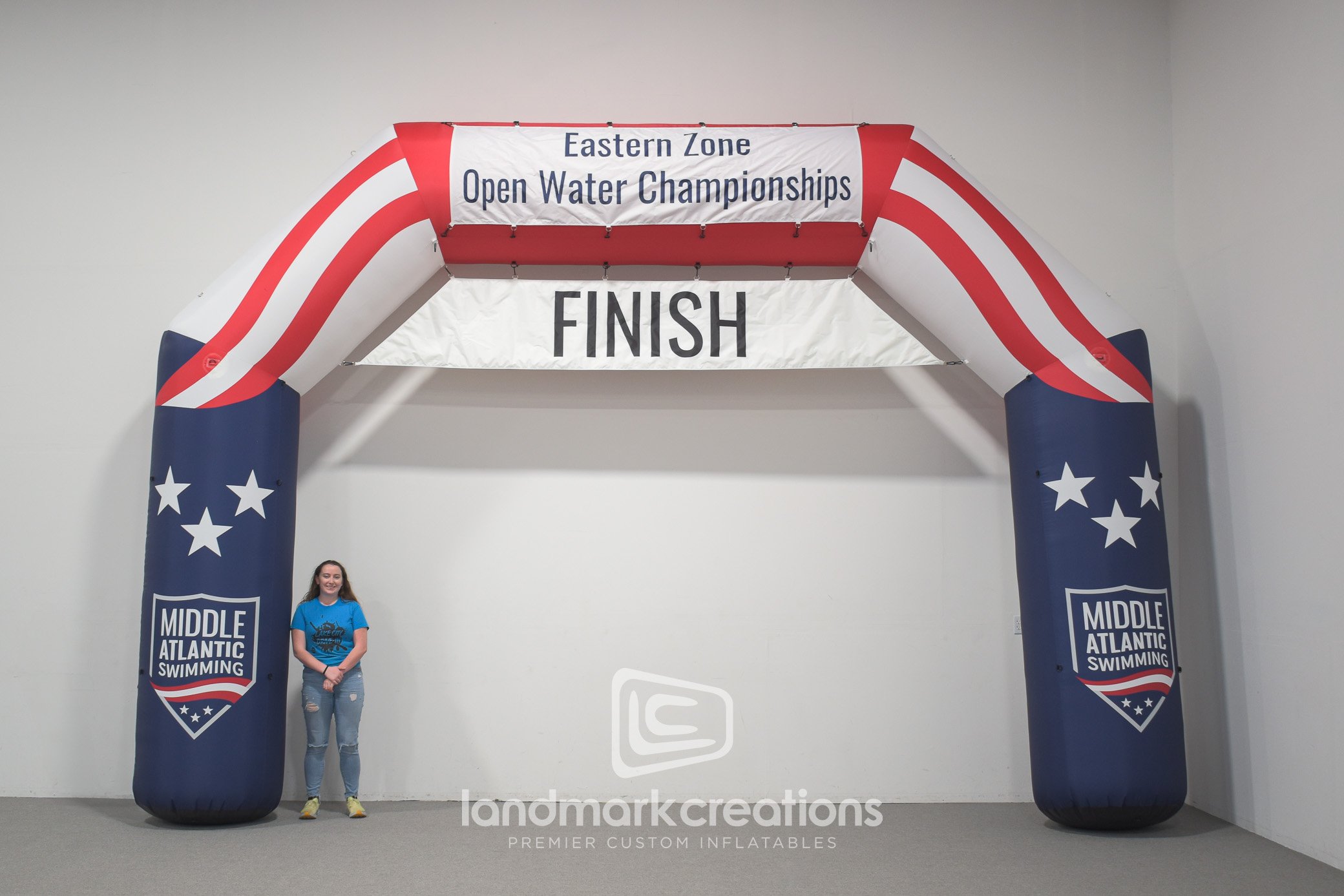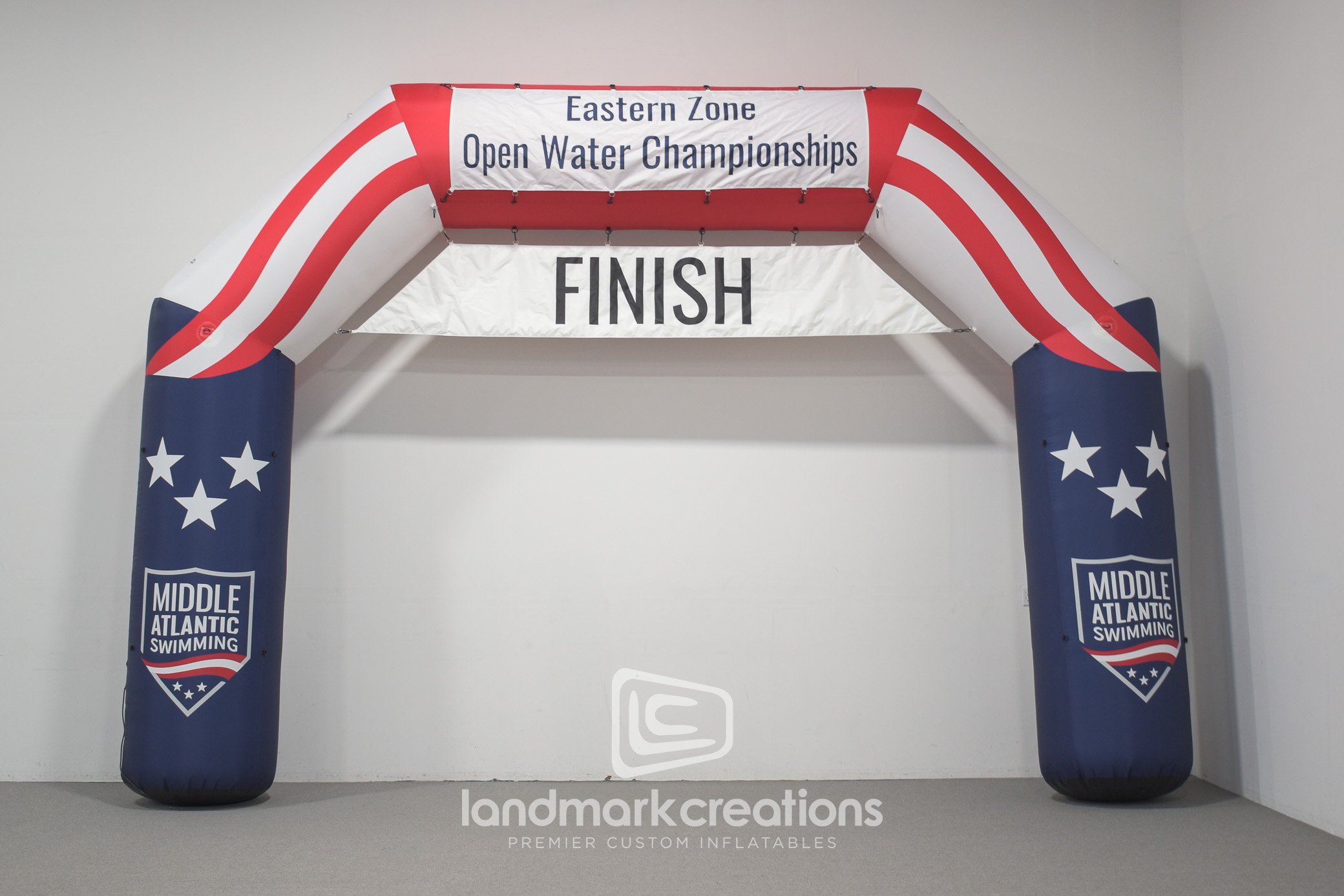 Middle Atlantic Swimming created this stars & stripes themed finish line arch for the Eastern Zone Open Water Championships at Beesley's Point Beach in Marmora, NJ. The custom inflatable archway created a striking visual at the beach, adding a professional look to their event and providing an eye-catching backdrop for photos of the participants. Inflatable racing arches can be made in any shape or color, with the option to provide message area for specific events or race sponsors!