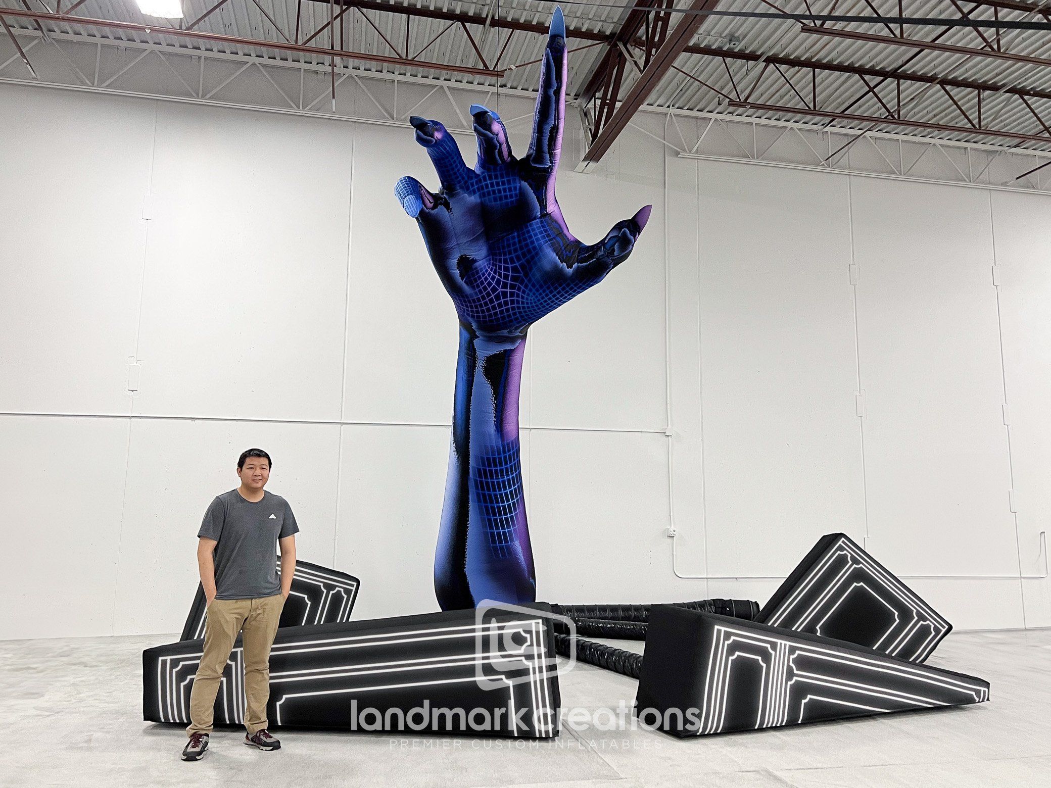 This visually striking inflatable hand, complete with foam-sculpted fingernails and abstract printed designs, was created for Puerto Rican artist Mora's international tour. Developed by FrameWorx, this inflatable set piece, with its hand-painted LED sunken doors, exemplifies how custom inflatables can elevate stage designs for concerts and tours. Engineered for easy transport and stage installation, giant inflatable set pieces are a perfect addition to any large-scale event that requires impactful visuals.
