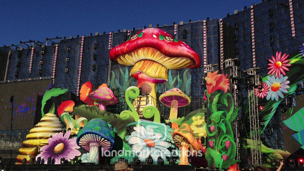This colorful inflatable mushroom was displayed on stage at the 2013 Electric Daisy Carnival in Las Vegas. The annual electronic dance and music festival used custom inflatable stage props to add dimension to the leading-edge, full entertainment experience!