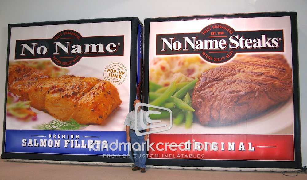 No Name, based in Minnesota, uses these inflatable replicas of their packaged steaks and salmon to promote specials at retail locations and grocery stores.